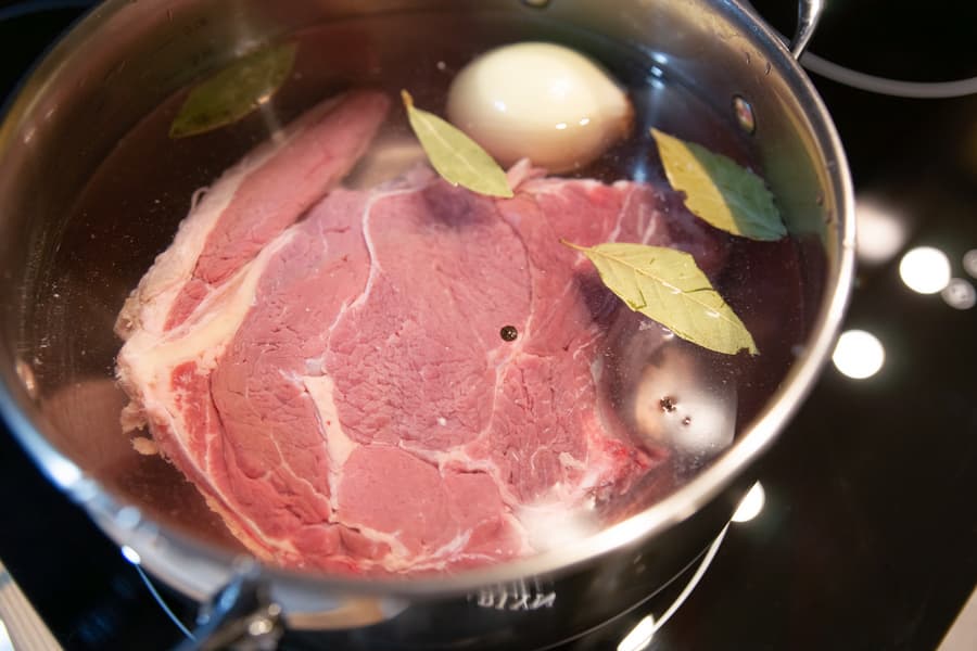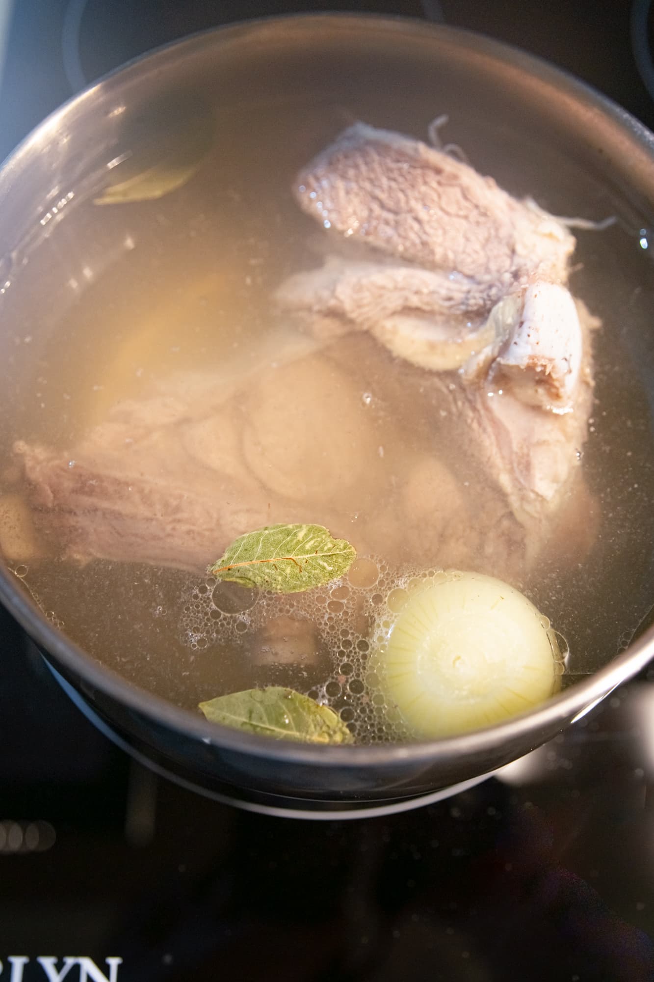 Поместили в кастрюлю кусок говядины на кости, луковицу, лавровые листья, черный перец горошком и щепотку соли, залили водой, накрыли крышкой и поставили закипать.