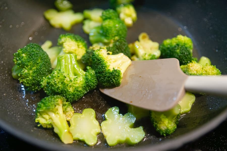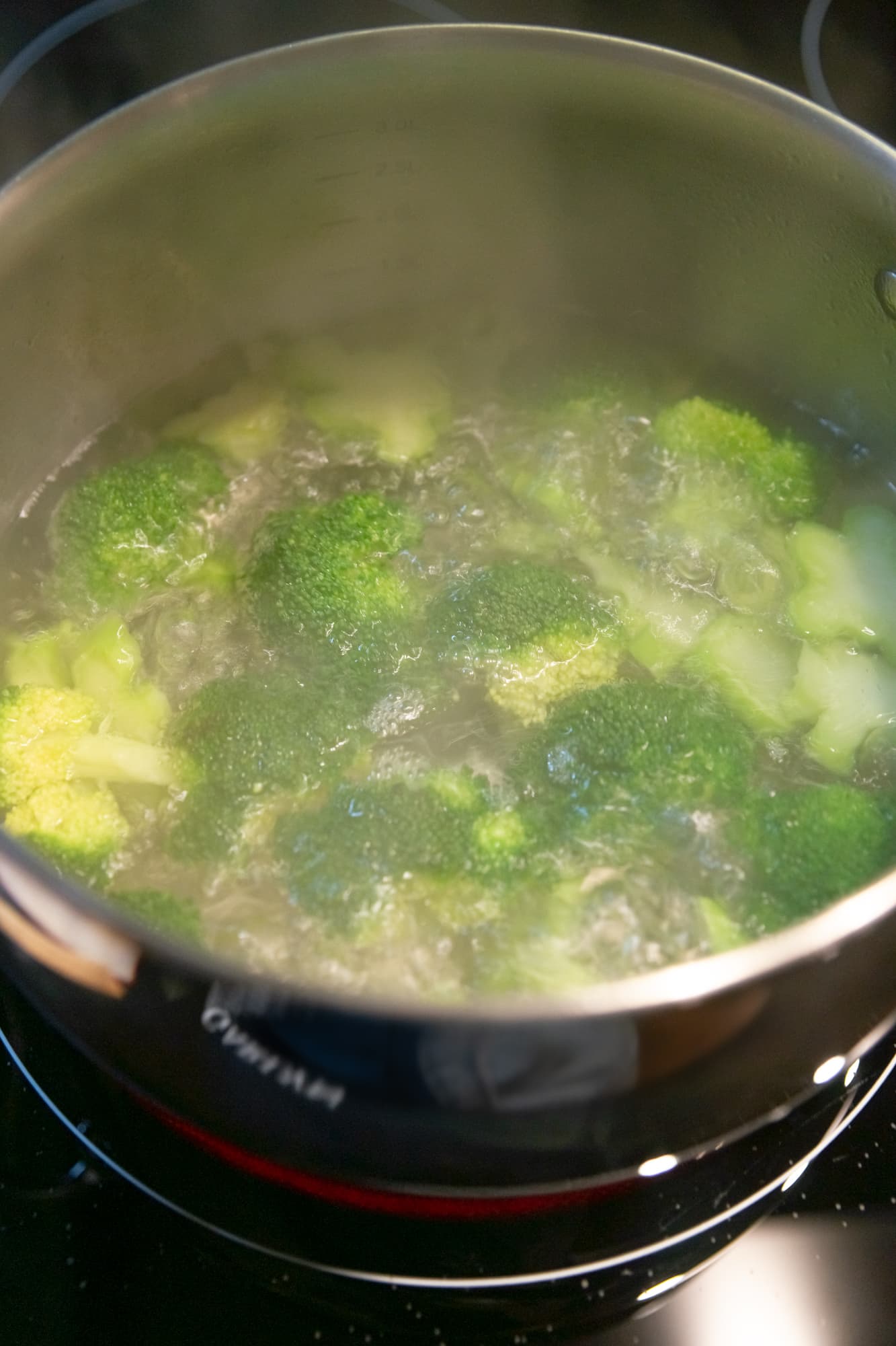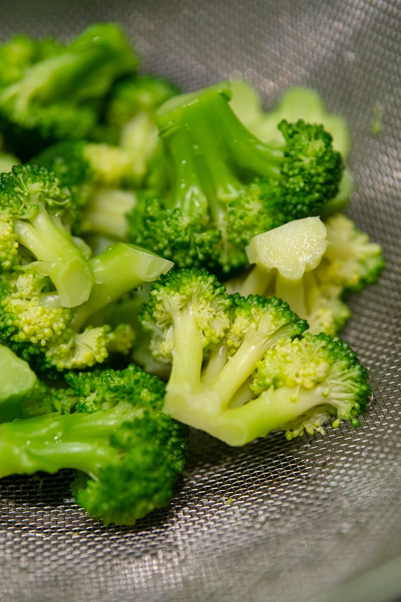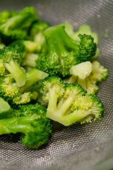 Для начала на 3 минуты опустили разделенную на соцветия брокколи в кипящую воду. Потом скинули ее на дуршлаг, обдали холодной водой и дали высохнуть.