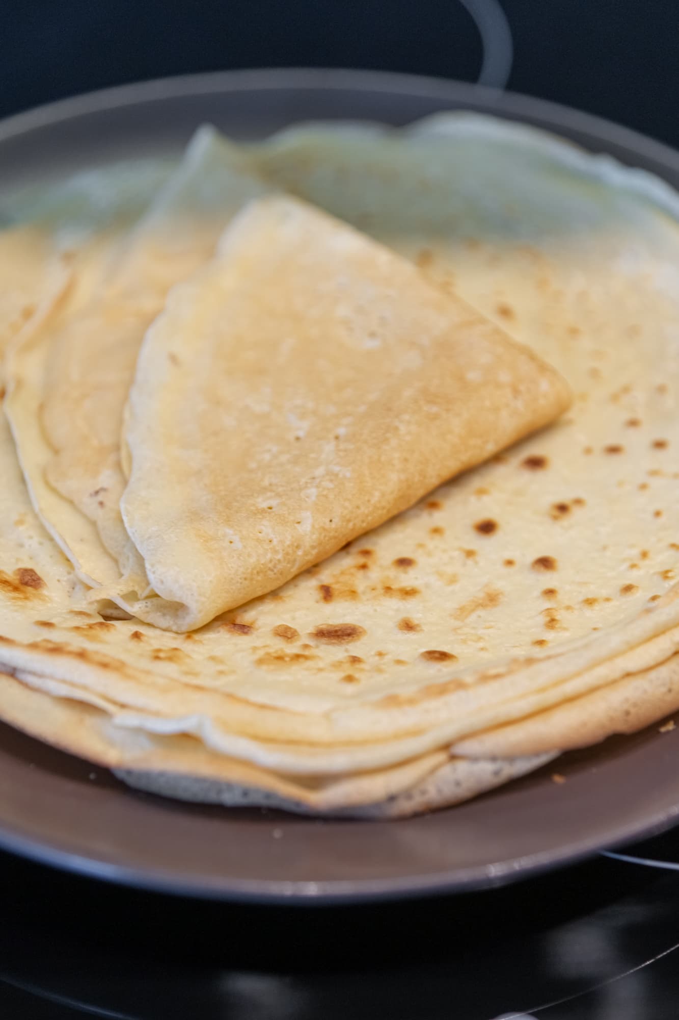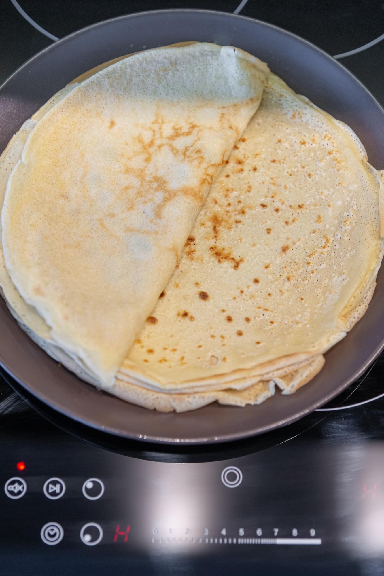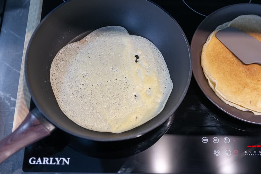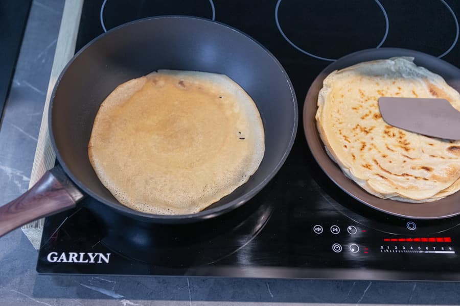 Блины мы жарили на сковороде диаметром 22 сантиметра, точно подходящей к двухконтурной круглой конфорке, используя максимальный уровень нагрева.