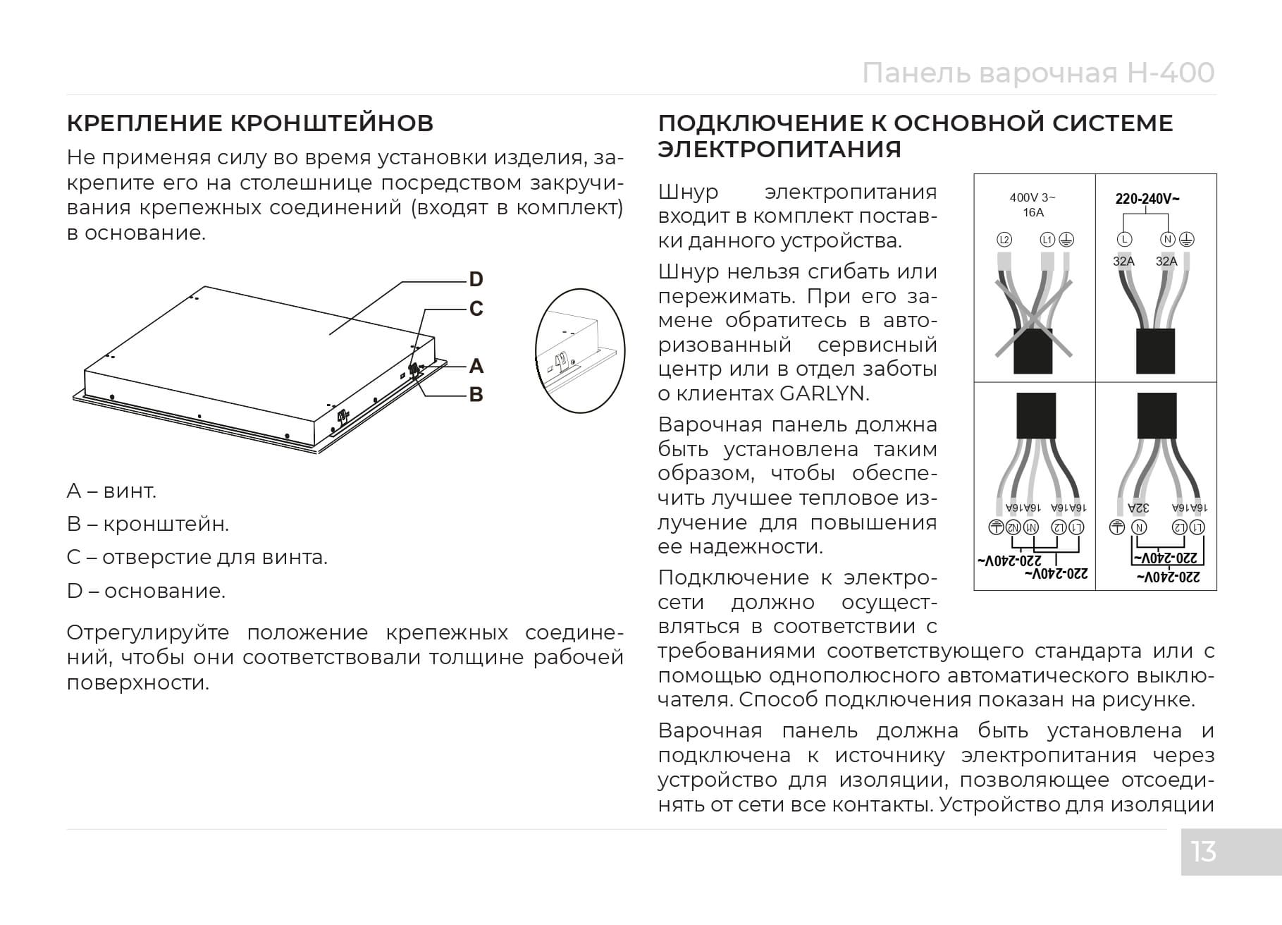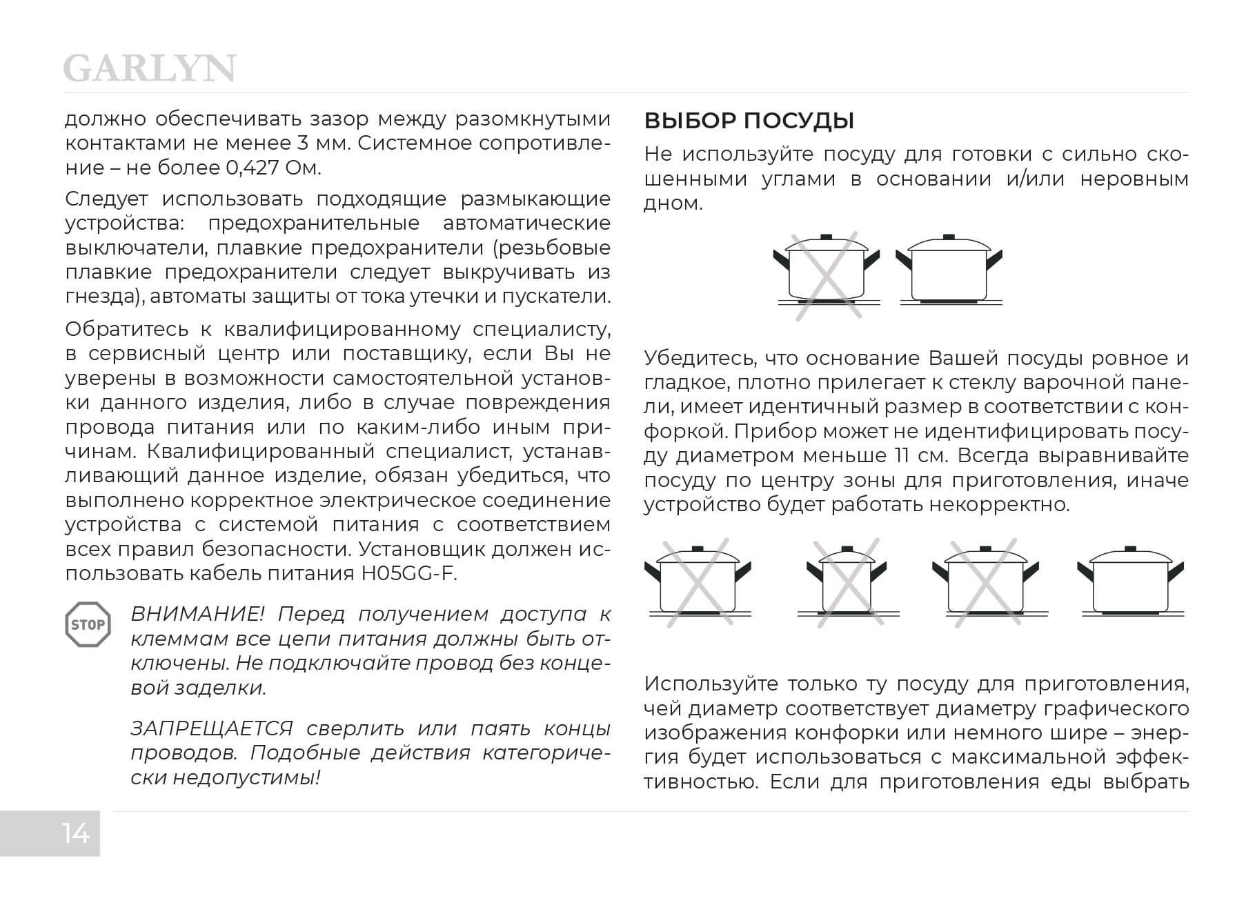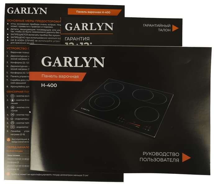 Вторая инструкция представлена в виде брошюры формата А5 также с качественной полиграфией и оформлением в стилистике Garlyn. Документ содержит подробную информацию о том, как устроена панель, о технике безопасности при ее эксплуатации, всех аспектах управления, о правильной установке и уходе за прибором.