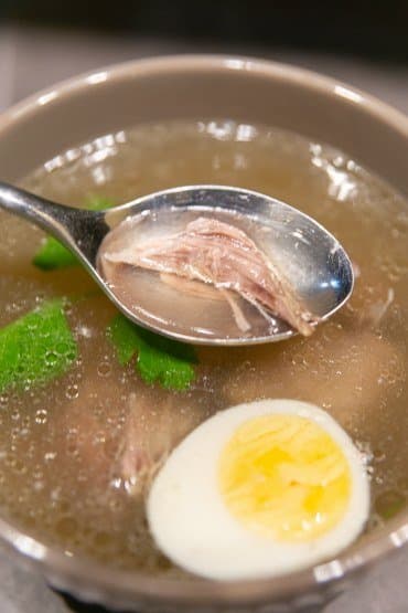 После закипания сняли пенку и убавили мощность до 5. Постепенно кипение стало едва заметным. Опустили термометр в воду и убедились, что бульон варится при 93-95 °C. В течение 2,5 часов варки бульона нам один раз пришлось увеличить мощность нагрева до 7 и потом снова убавить до 5, иначе кипение прекращалось совсем.