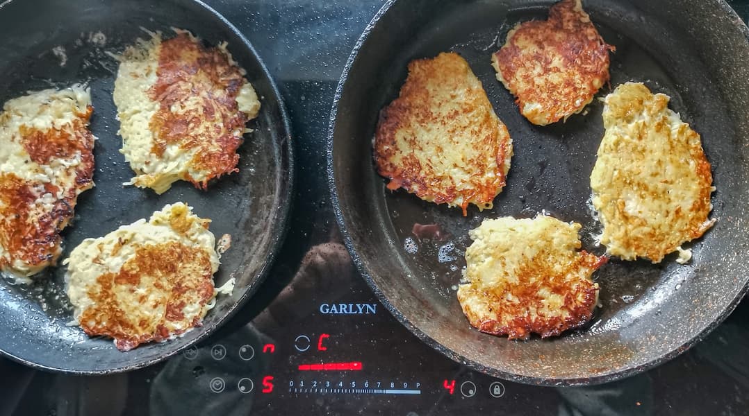 Мы взяли мелко потертую картошку, тертый сыр и решили сделать сырные драники. Для ускорения процесса мы готовили на двух сковородах, на ближних конфорках на средней мощности.