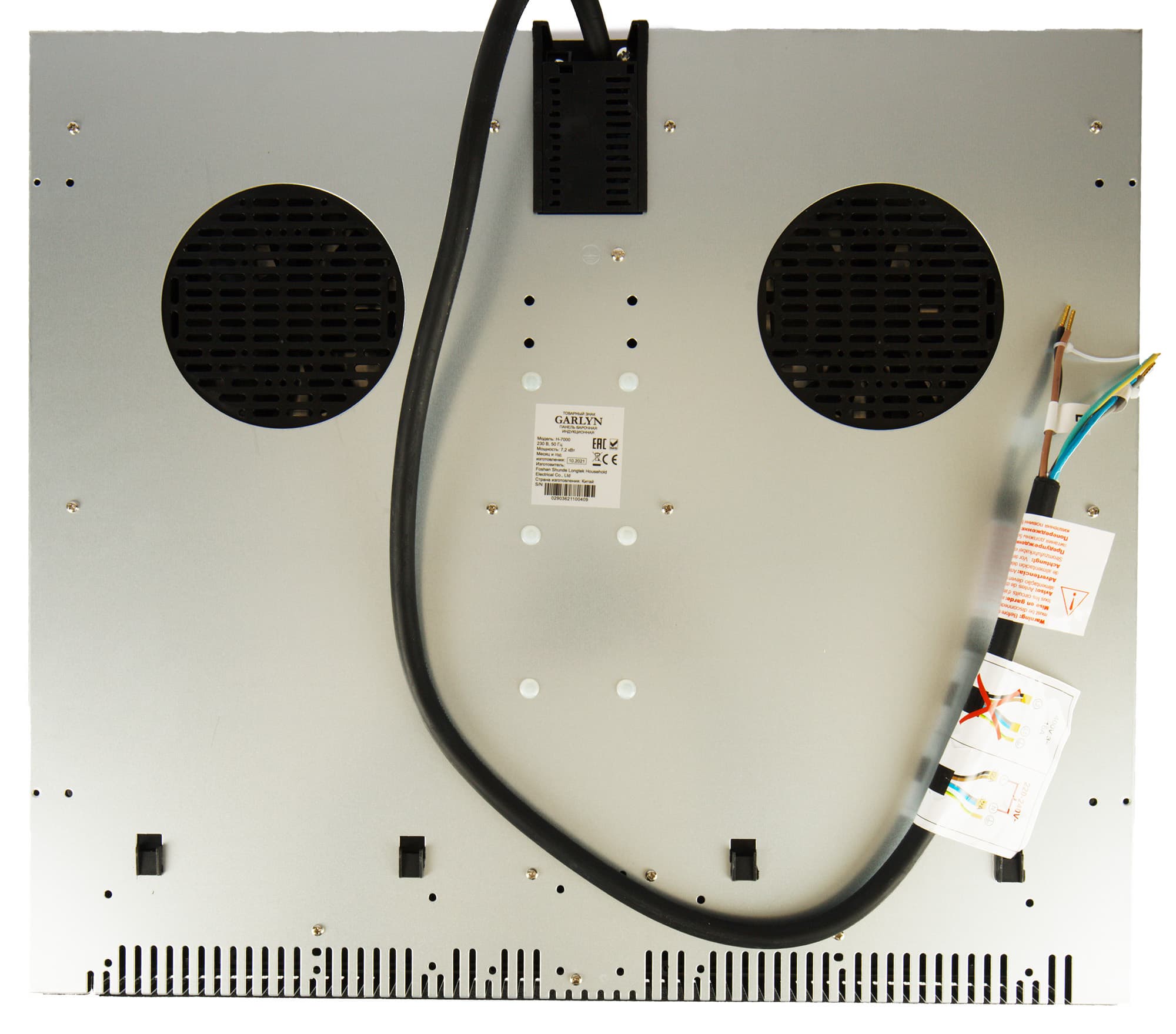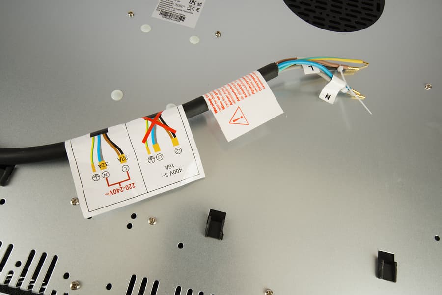 На нижней стороне плиты организован выход электрического шнура. Шнур достаточного сечения для мощности прибора. Жилы помечены маркерами, к проводу прикреплены схемы подключения.
