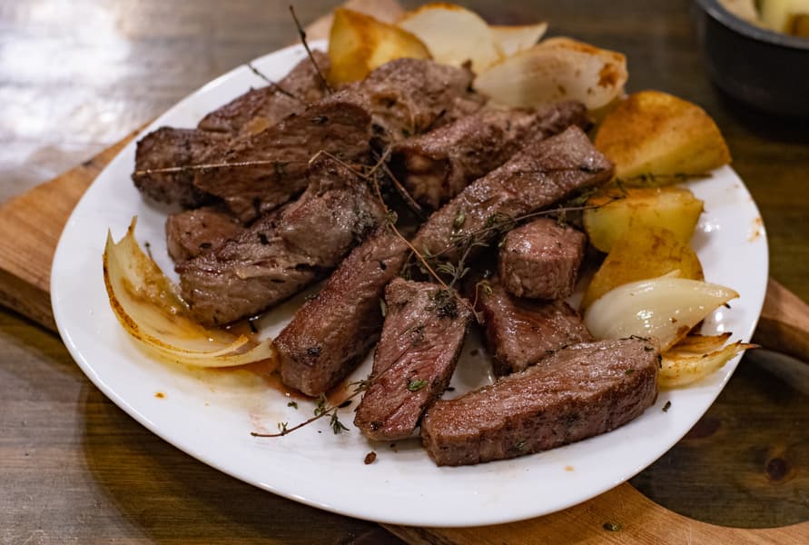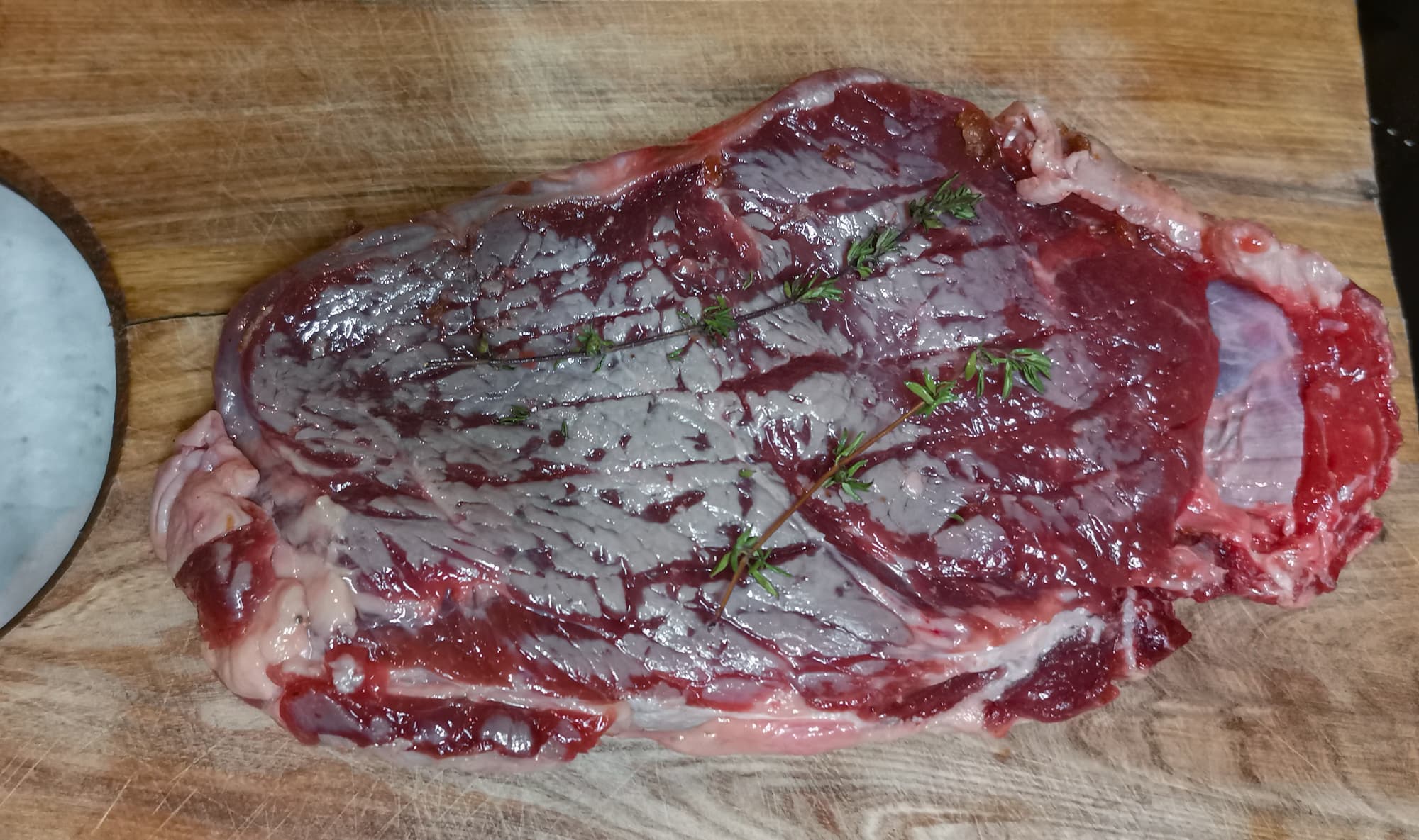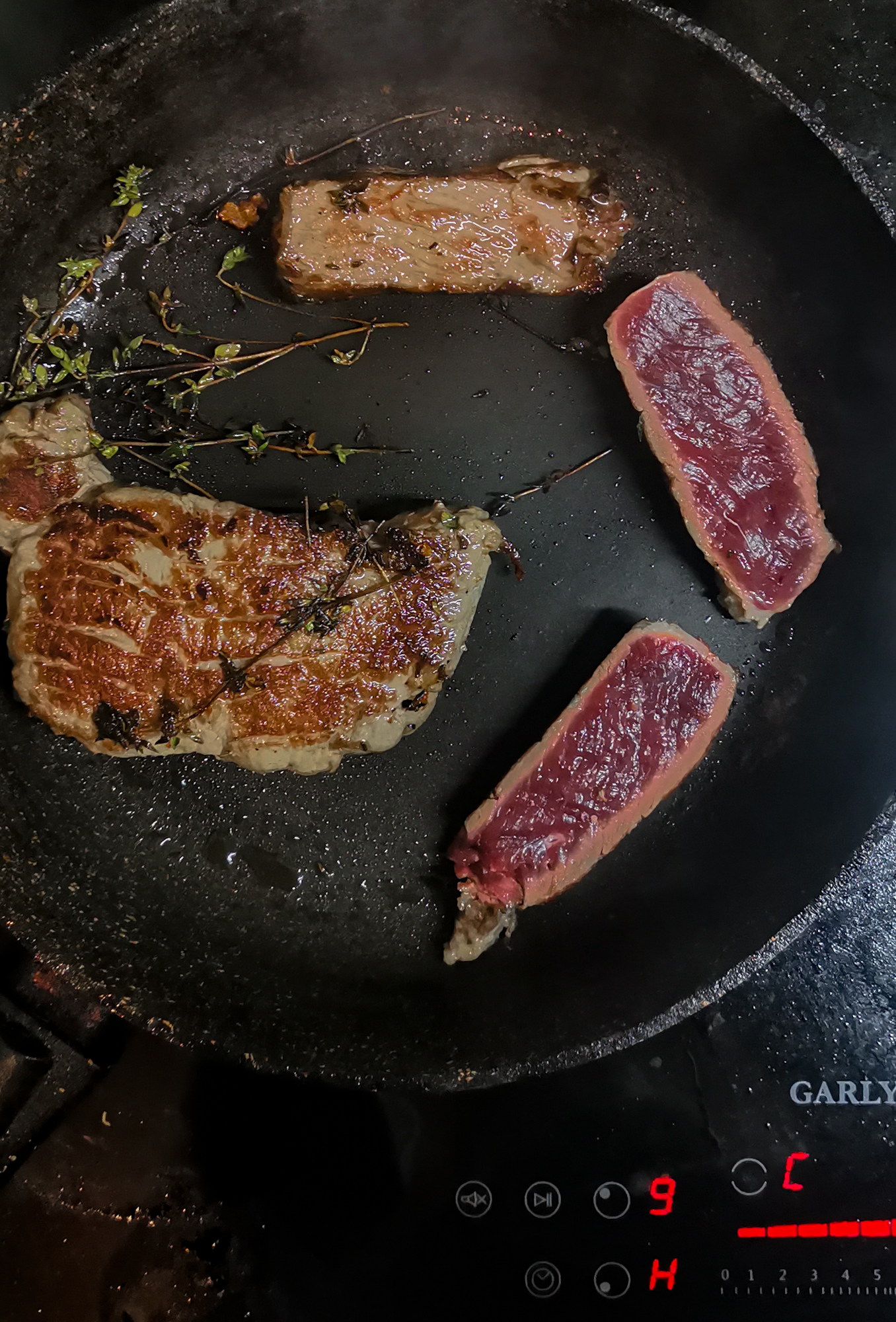Переложили кусок на тарелку, и, пока готовился следующий антрекот, разрезали его на куски в 1,5 пальца толщиной. Выкладывали по 2-3 на сковородку на максимальную мощность. Обжаривали быстро с двух сторон на небольшом количестве чесночного масла с добавлением тимьяна.