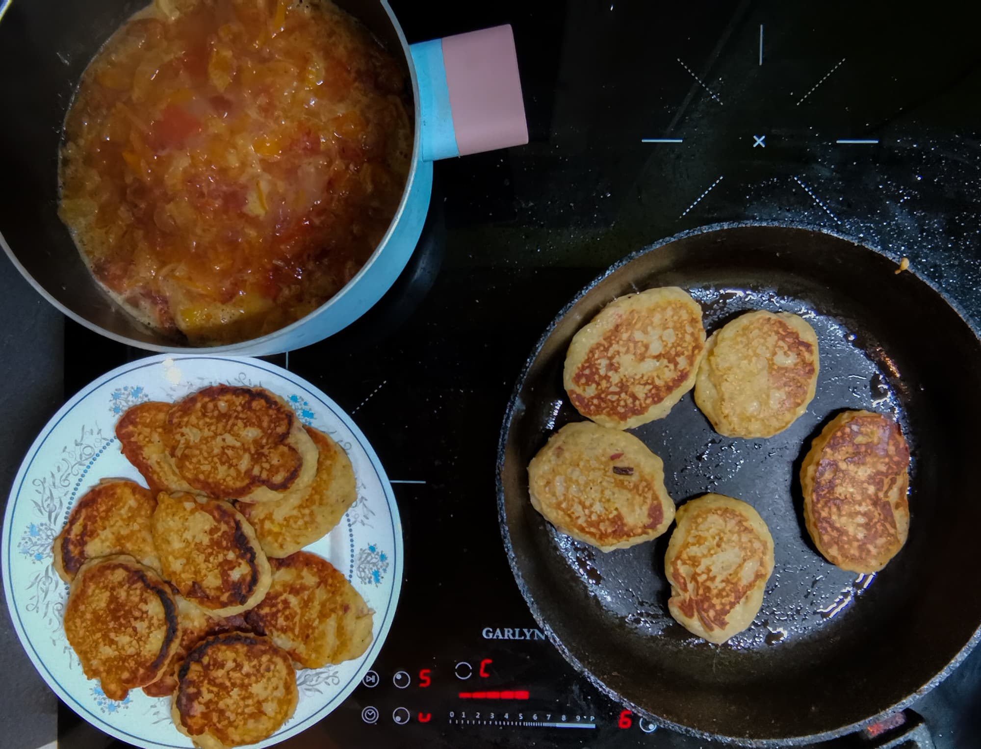 Пока варенье варилось, на передней конфорке делали оладьи. Для нашей сковороды была удобна мощность 6.