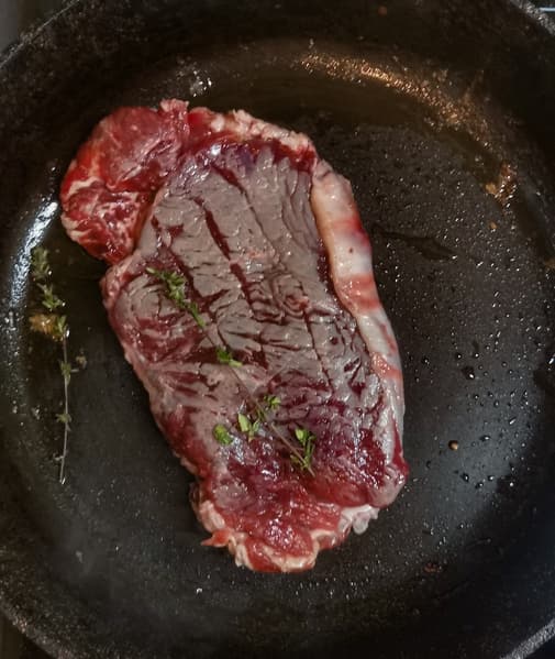 Выложили на сковороду при максимальной температуре. Добавили тимьян. Обжарили до корочки с двух сторон.