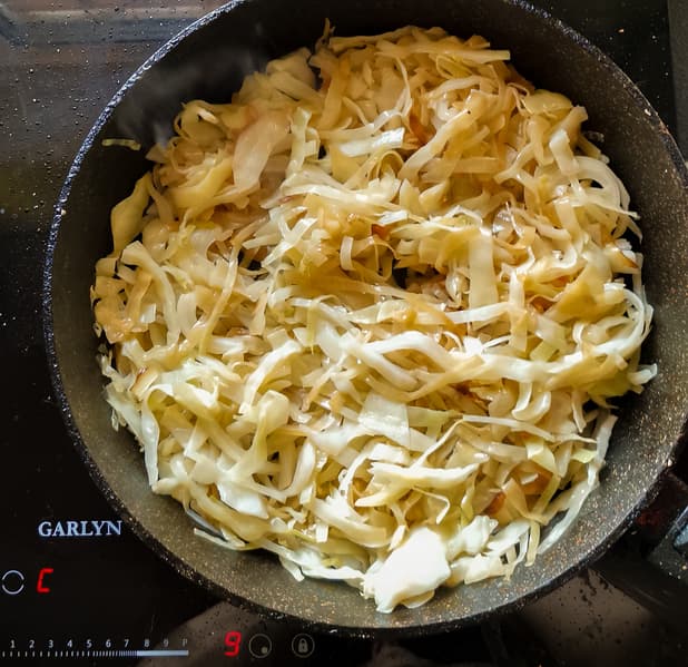 Свежую нашинкованную капусту мы обжарили в сковороде на максимальной мощности, затем убавили мощность до половины и довели капусту до готовности. Вбили яйцо.
