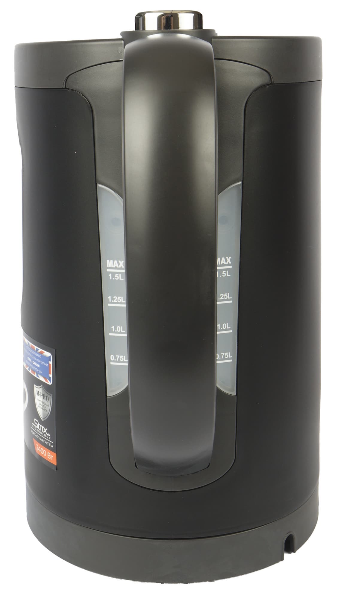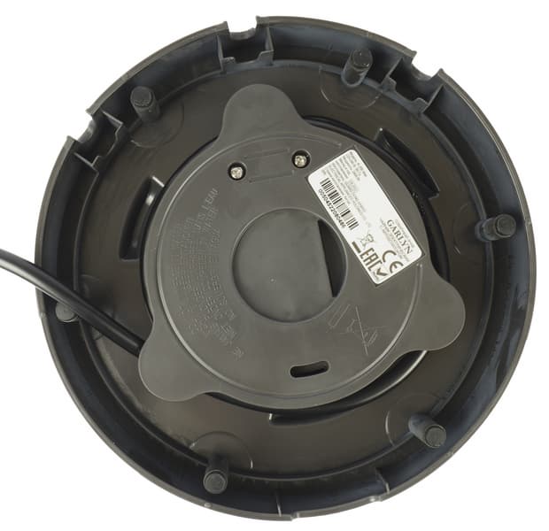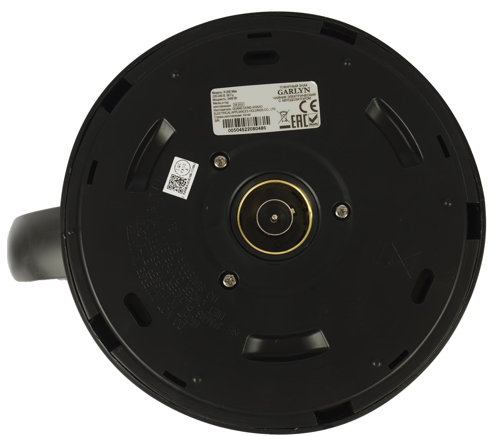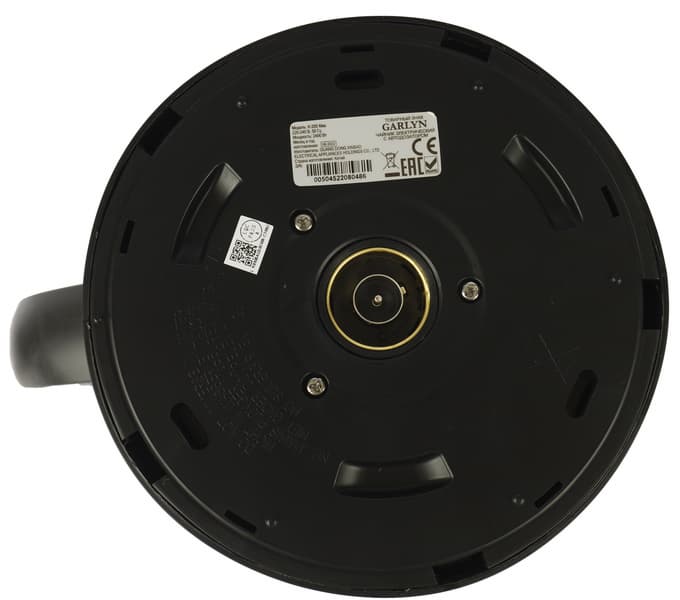 На дне чайника находится шильдик с краткой технической информацией о приборе и три выемки для установки на базу. У прибора установлен английский контроллер Strix, зарекомендовавший себя долговечным и надежным (гарантируется до 15 тысяч циклов кипячения). Контактная группа состоит из одного кольца и центрального штыря.