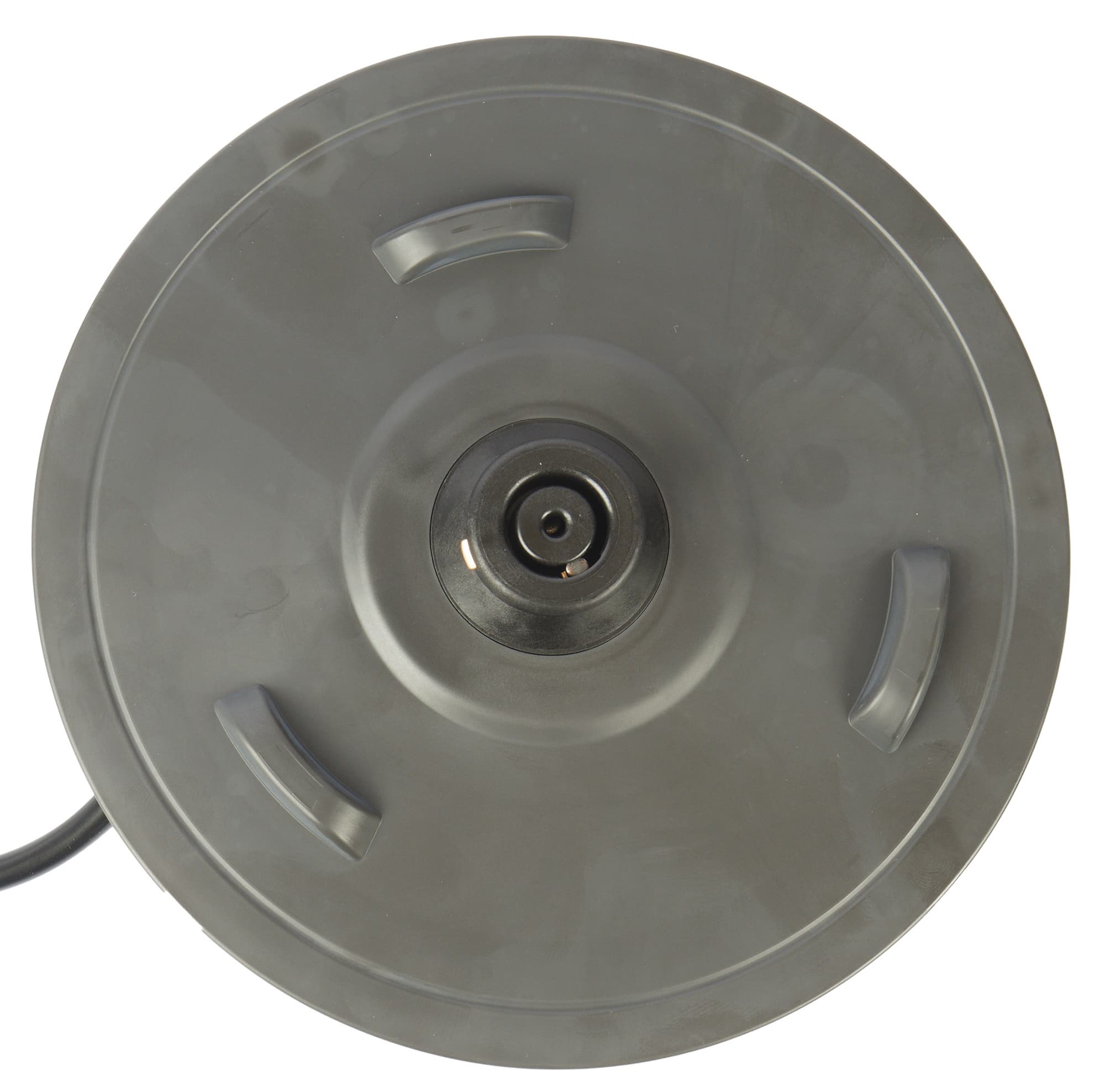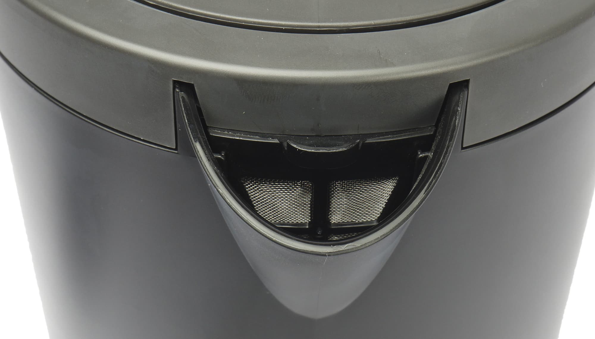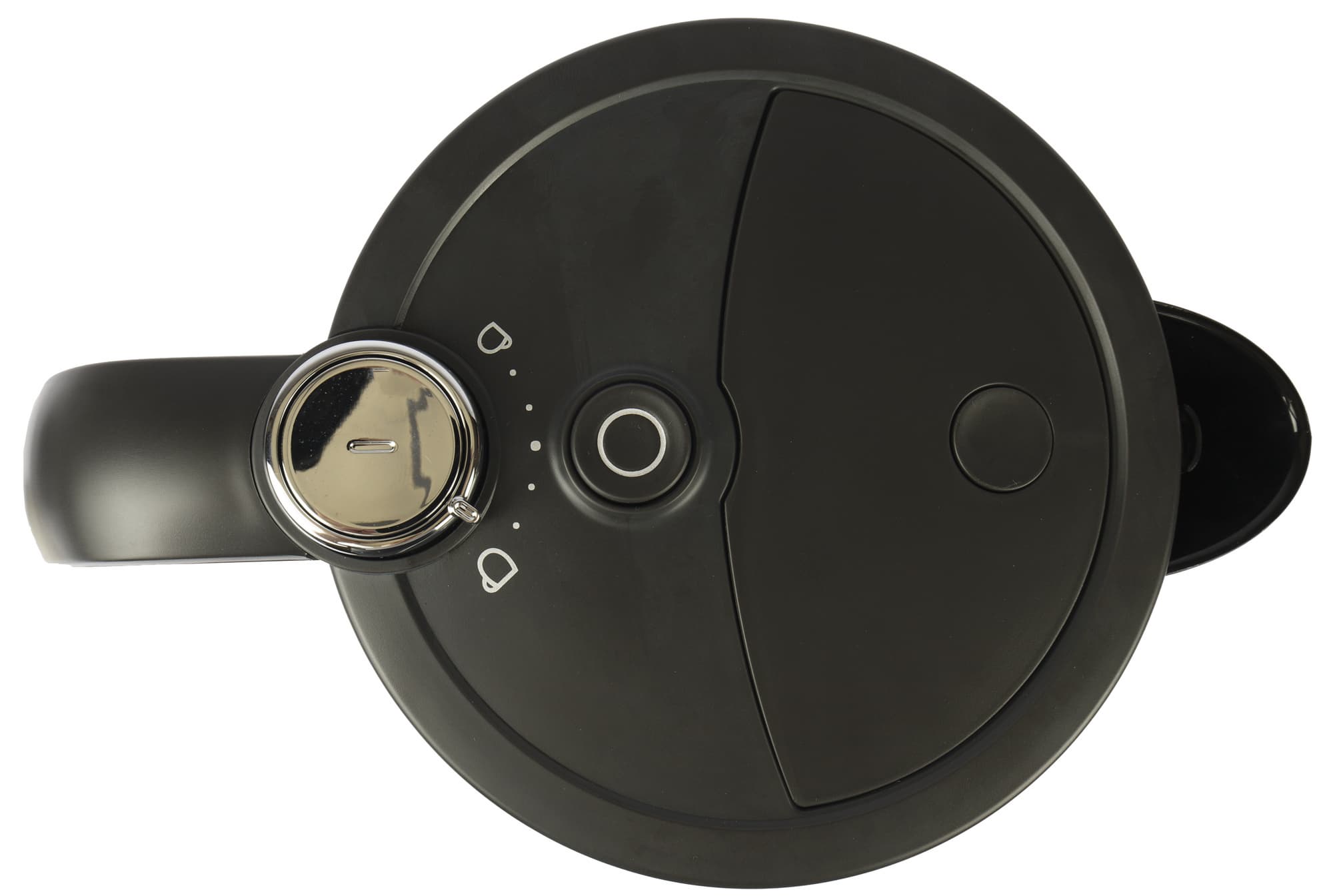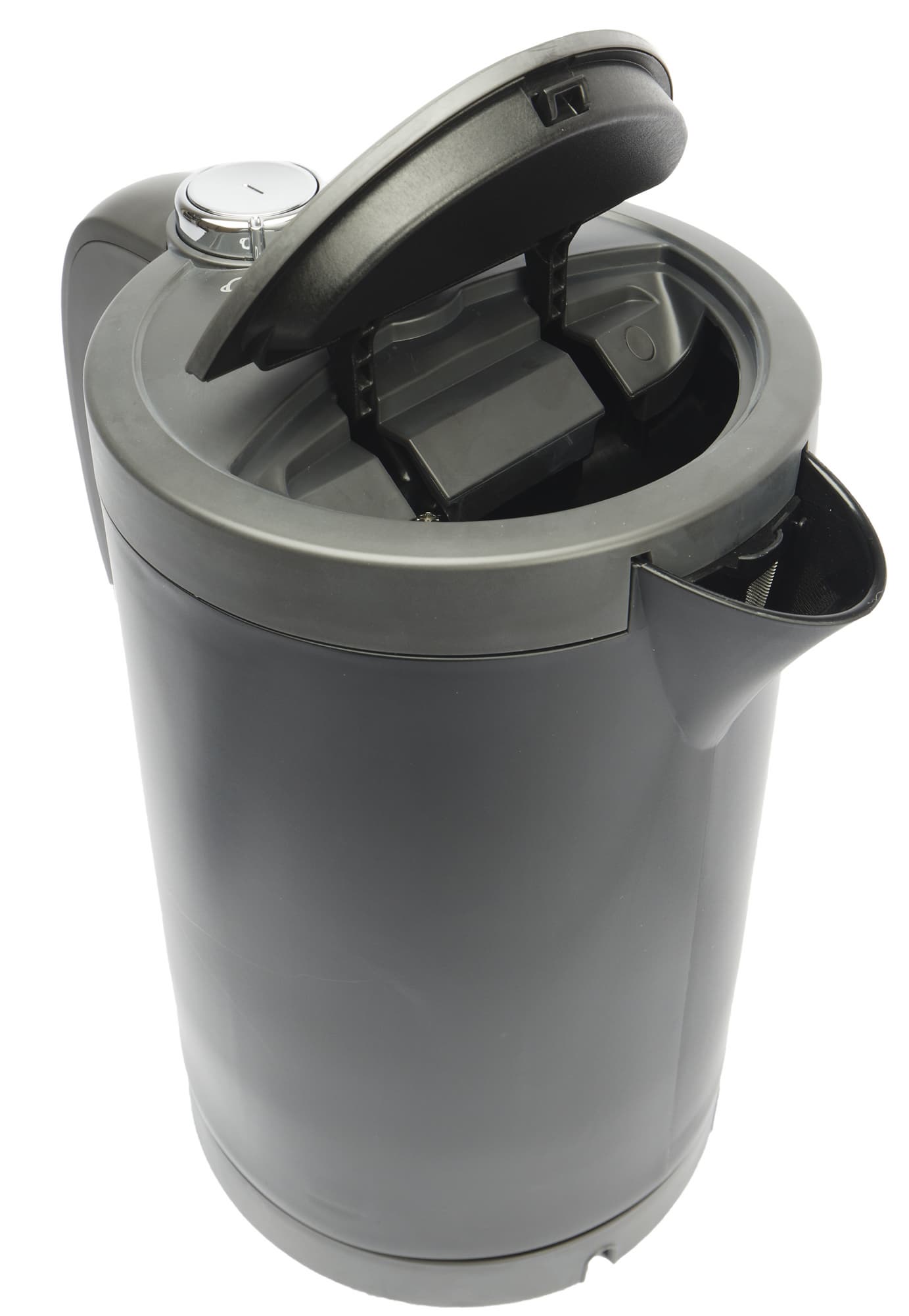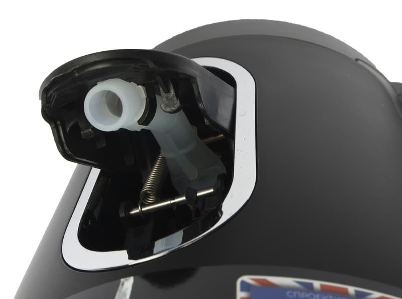 Крышка чайника сделана из черного пластика. К нашему сожалению, она не снимается с прибора. Более того, открывается лишь половина крышки. И это, пожалуй, сразу можно отнести к минусам данной модели. Как вы понимаете, о ручной чистке прибора изнутри не может быть и речи. Причиной такого решения является наличие внутри колбы небольшого насоса, прикрепленного сверху под неподвижной частью крышки. И это же, как мы догадались, является причиной малого полезного объема колбы, несмотря на обычные габариты чайника.