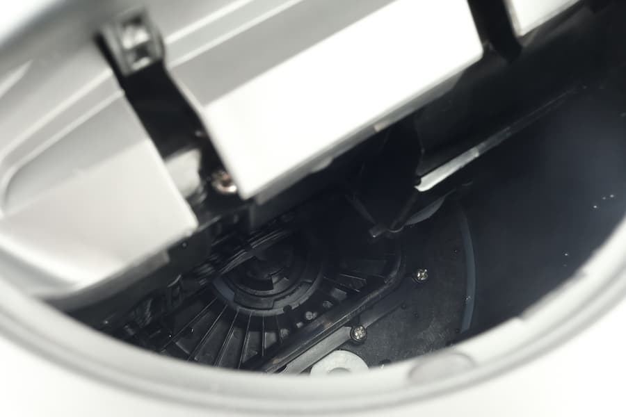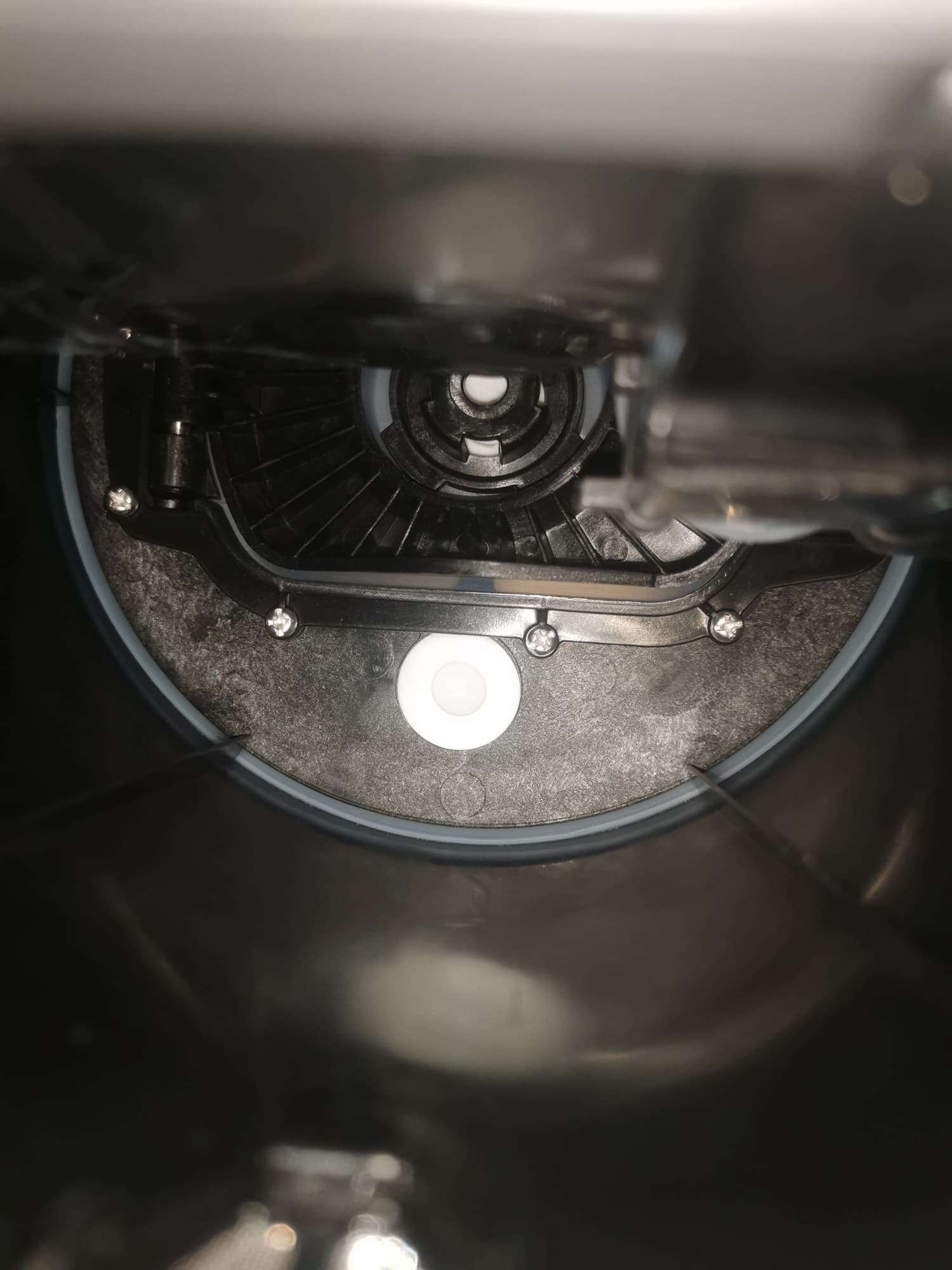 Взглянув на открытый чайник сверху, мы видим нечто необычное: на дне расположен небольшой пластиковый люк. Путем экспериментов с кнопками выключенного чайника мы выяснили, что люк находится в открытом состоянии при закрытом автодозаторе, и наоборот — открытие автодозатора приводит к мгновенному захлопыванию люка. В центре люка находится клапан, через который в нижний отсек могут «подсасываться» вода и воздух. Более подробно мы рассмотрим принцип действия этого механизма в разделе «Эксплуатация».