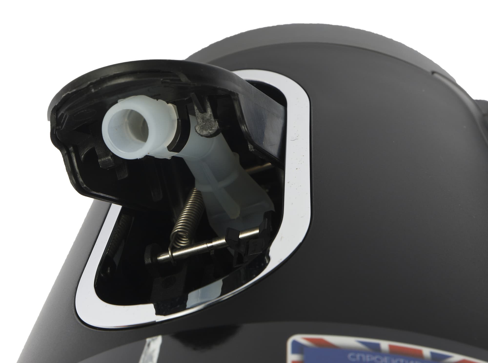 Открытие автодозатора происходит при уверенном нажатии на кнопку с изображением капли на корпусе чайника. Нажатие сопровождается небольшим щелчком, после чего крышка отсека отпружинивает и с небольшим усилием (самого механизма) открывается.