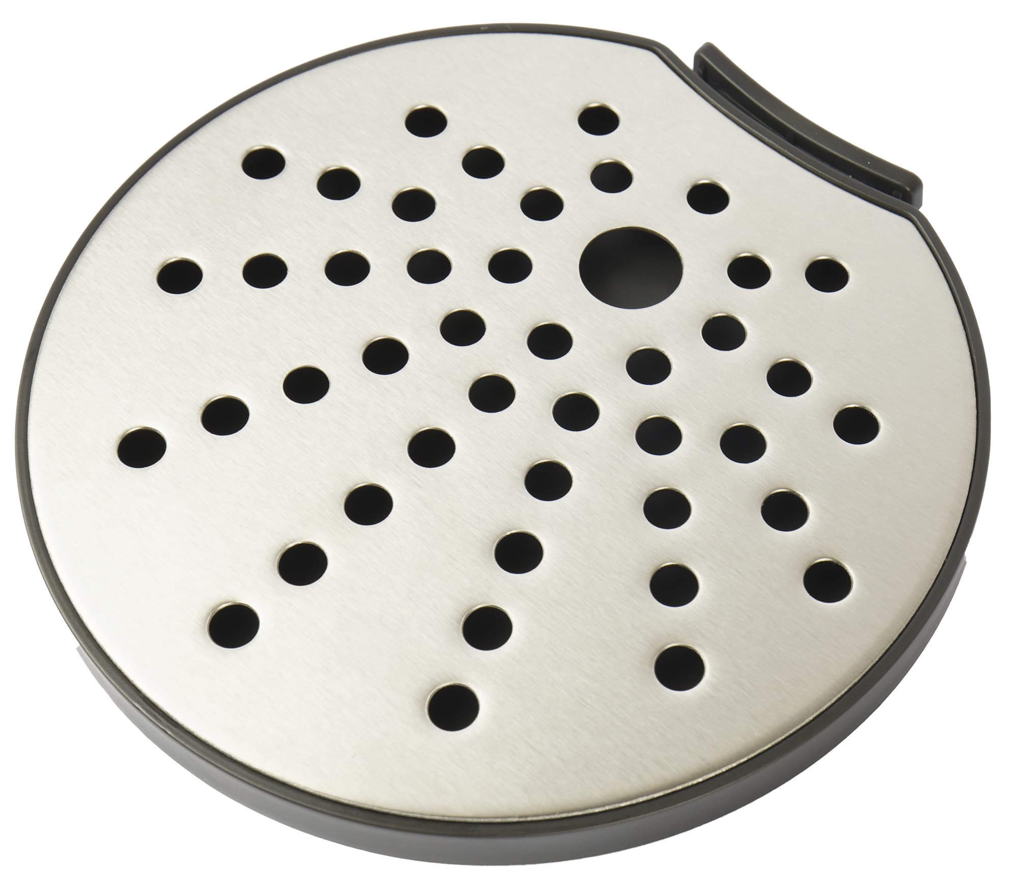 По инструкции при открытом автодозаторе следует всегда устанавливать поддон для сбора капель. В нем нет ничего примечательного — круглое черное пластиковое основание с креплением под базу чайника и решетка из нержавеющей стали с перфорацией.