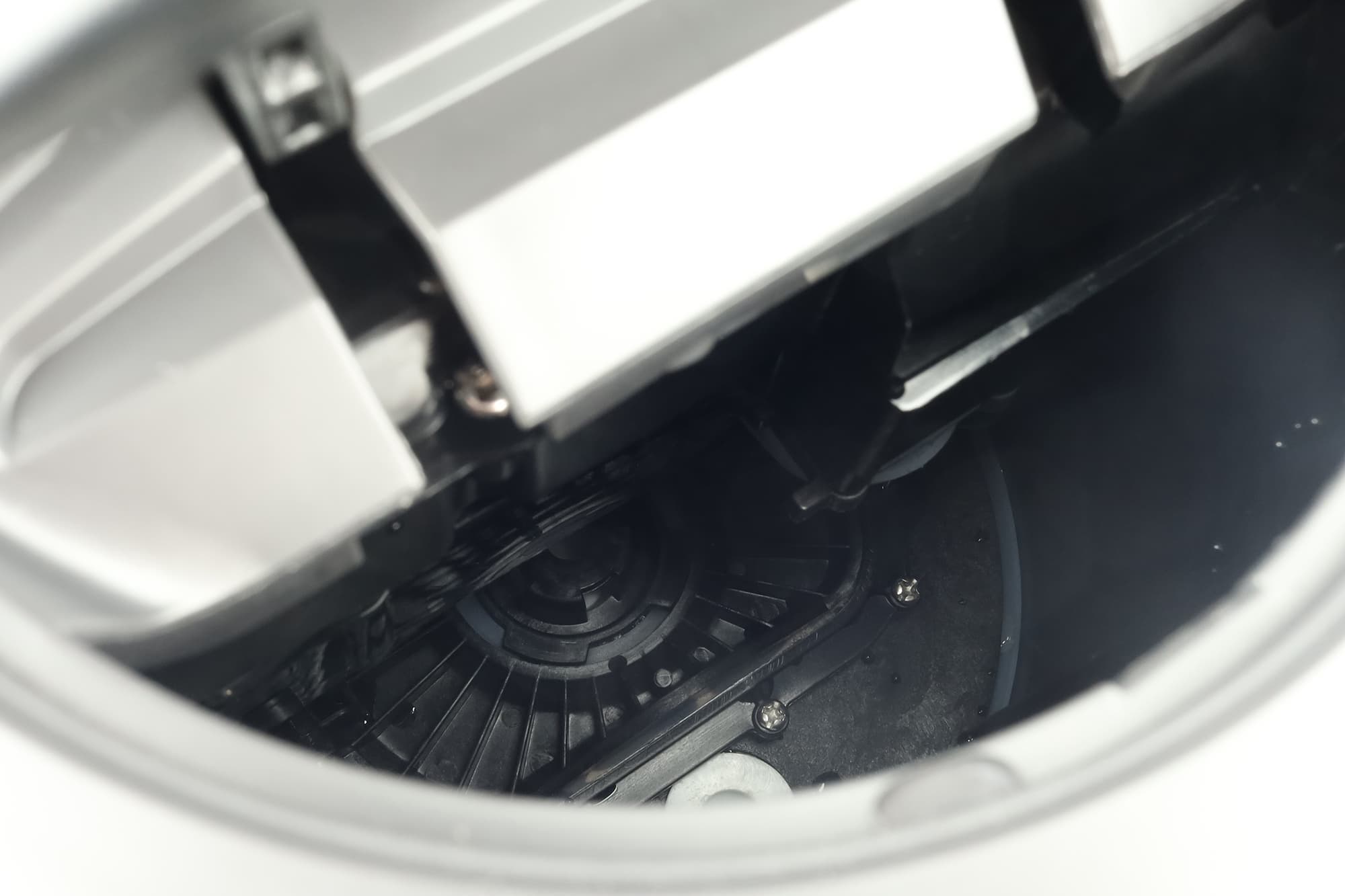 Пространство, открывающееся взору при открытой крышке, не так велико, поэтому рассмотреть чайник изнутри более детально не представляется возможным. Однако нам удалось (с трудом) просунуть внутрь руку и нащупать под неподвижной частью крышки насос в пластиковом коробе, о котором мы писали выше. Его примерные размеры 5×5×5 см — небольшой, но внушительный по отношению к колбе чайника.
