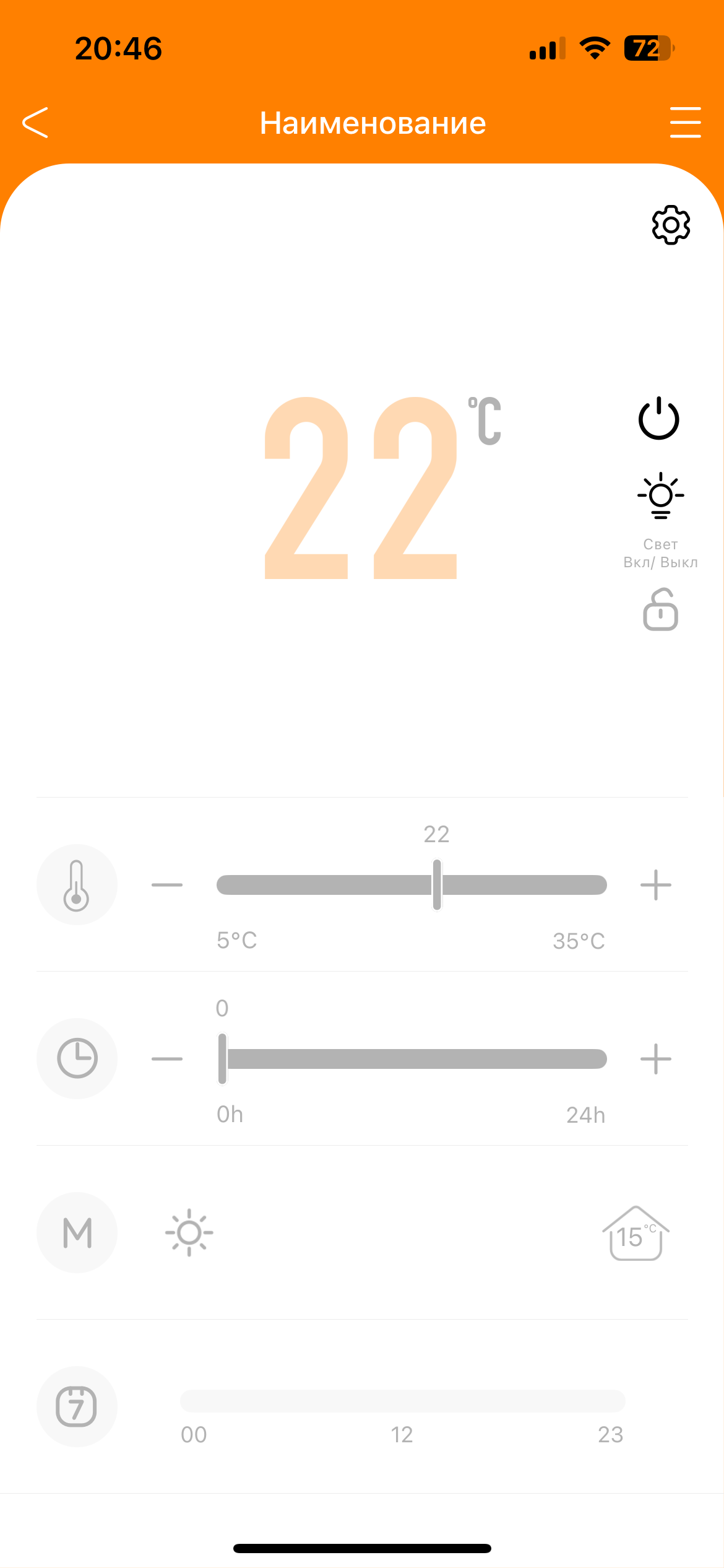 Здесь мы можем включить и выключить устройство, выбрать температурный режим, установить таймер, отрегулировать яркость подсветки панели управления, сменить тему главной страницы приложения со светлой на темную, заблокировать/разблокировать панель управления, перейти в раздел установки личного расписания включения/отключения прибора или в раздел настроек.