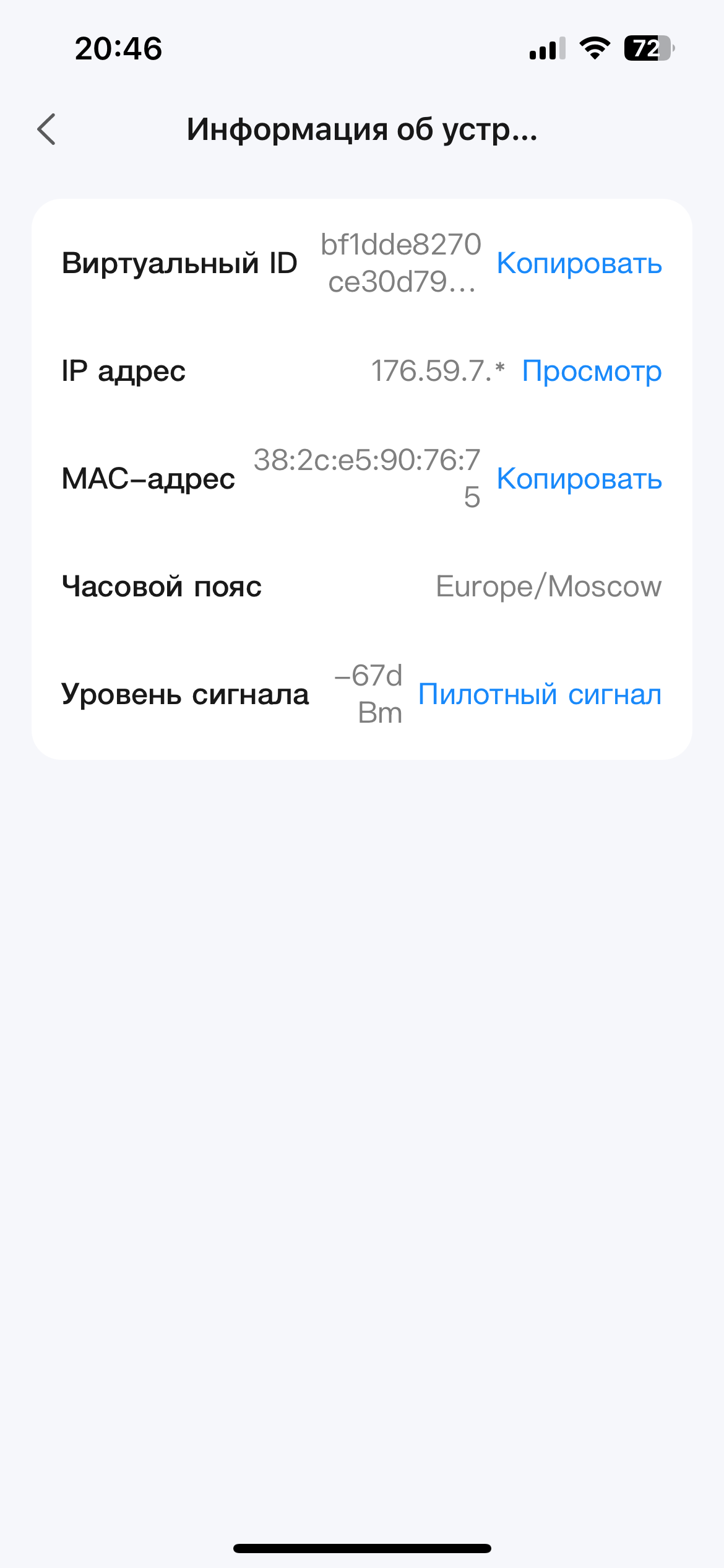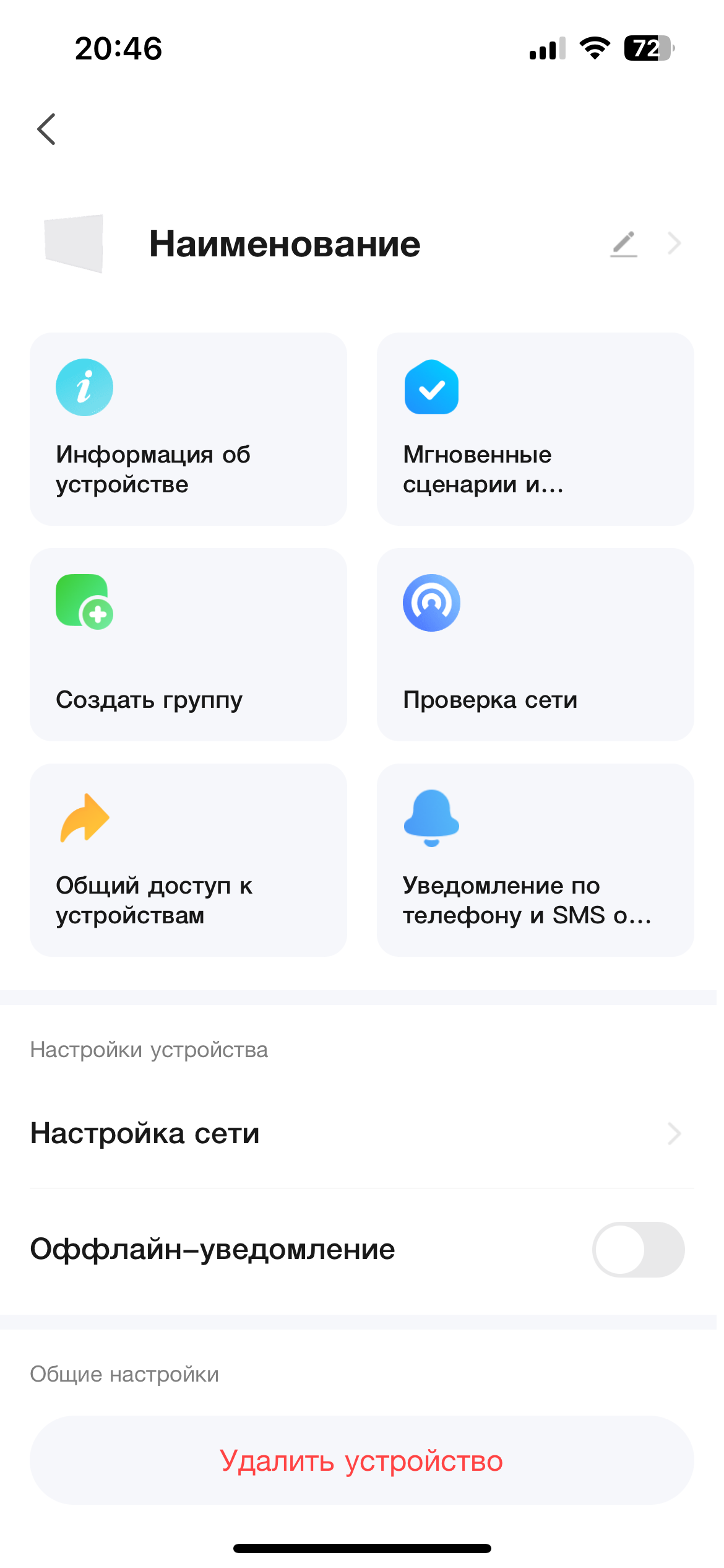 В пункте управления устройством есть раздел настроек, где мы можем изменить наименование или расположение устройства, узнать данные о приборе и создать сценарии умного дома, включающие работу прибора.