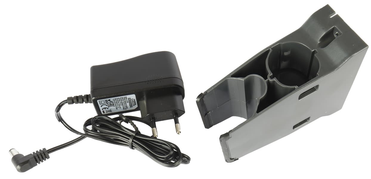 Настенный подвес позволяет удобно хранить пылесос и одну из насадок. Дополнительных мест для других аксессуаров тут не предусмотрено. Адаптер питания подключается непосредственно к корпусу прибора.