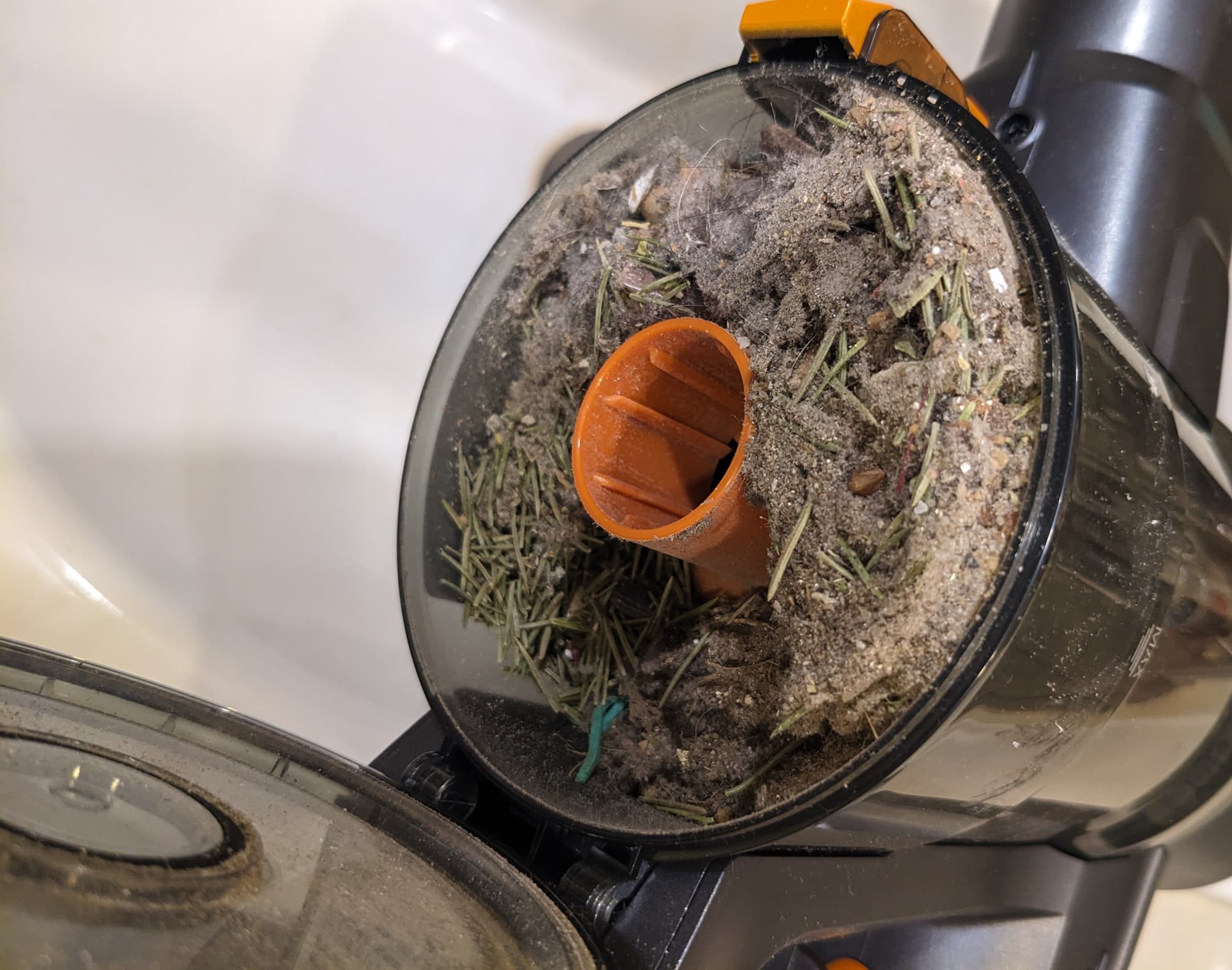 Для опорожнения пылесборника служит откидывающаяся крышка, удерживаемая оранжевой клавишей. Вытряхивать мусор можно одной рукой без риска запачкаться или просыпать содержимое.
