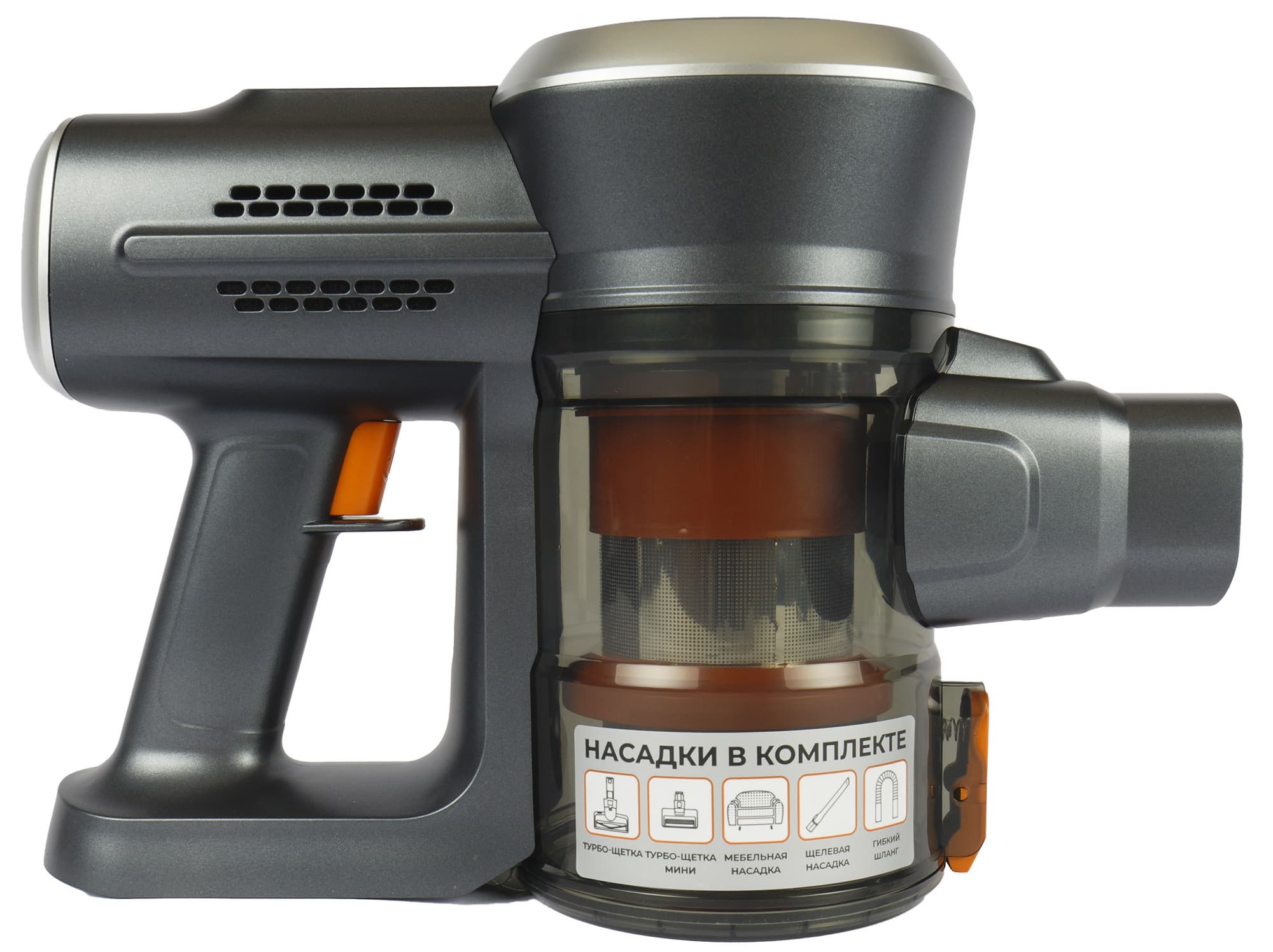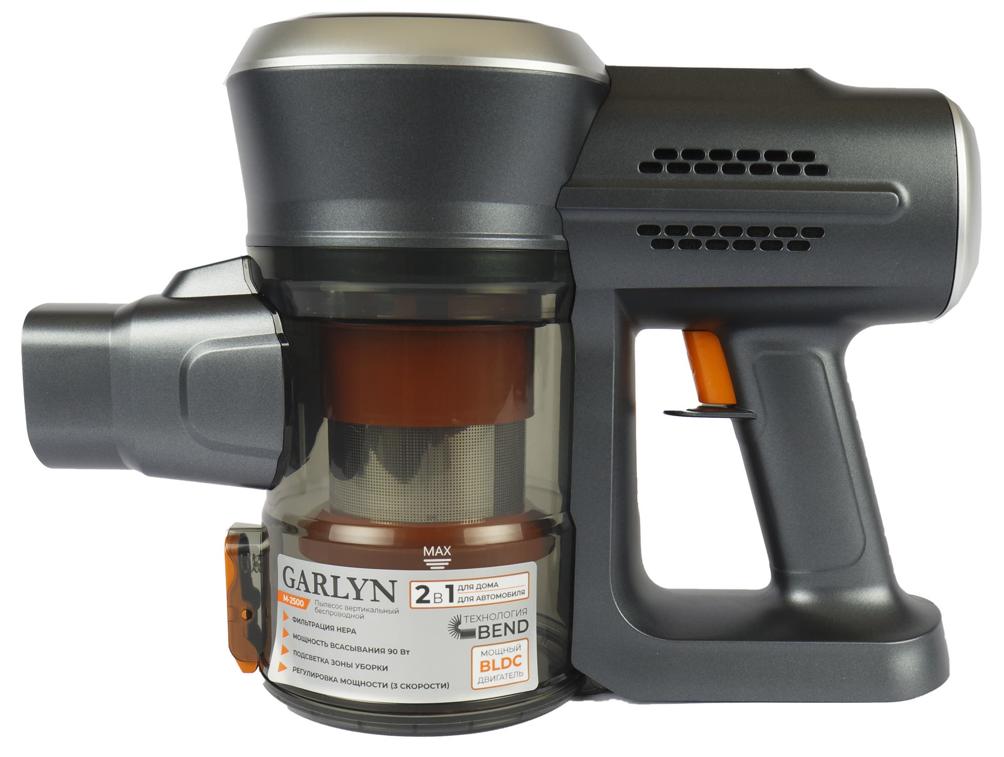 Немногие производители в наше время придерживаются единого фирменного оформления в линейках бытовой техники. Приятно видеть, что Garlyn среди них. Все подвижные детали — защелки, клавиши, кнопки и циклонный фильтр — сделаны из ярко-оранжевого пластика, который напоминает об узнаваемом стиле компании.