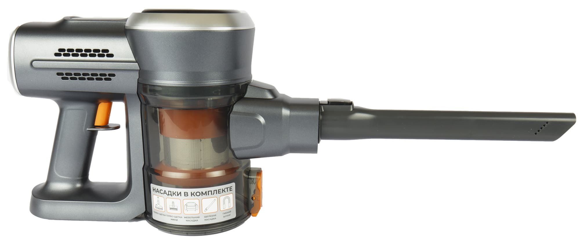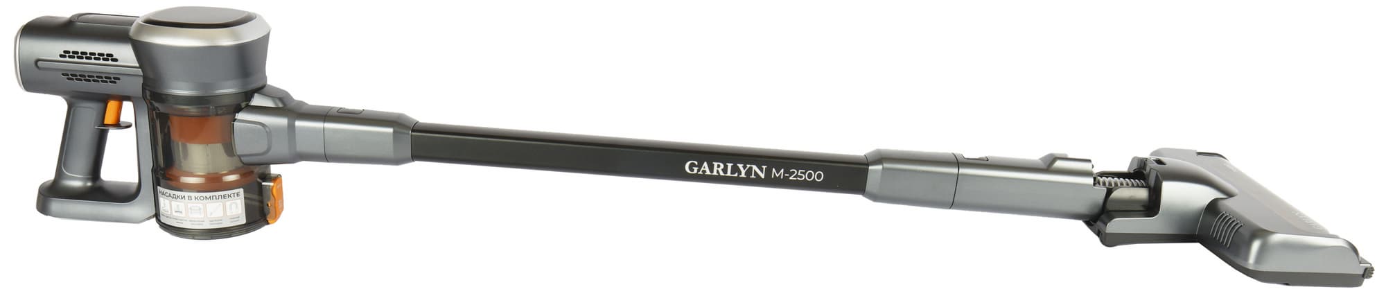 Хотя M-2500 — младший представитель линейки беспроводных пылесосов от Garlyn, по комплектации этого не скажешь: в комплект входят целых две электронасадки, а в дополнение к стандартной удлинительной трубке производитель добавил еще одну — шарнирную, для ручной уборки.