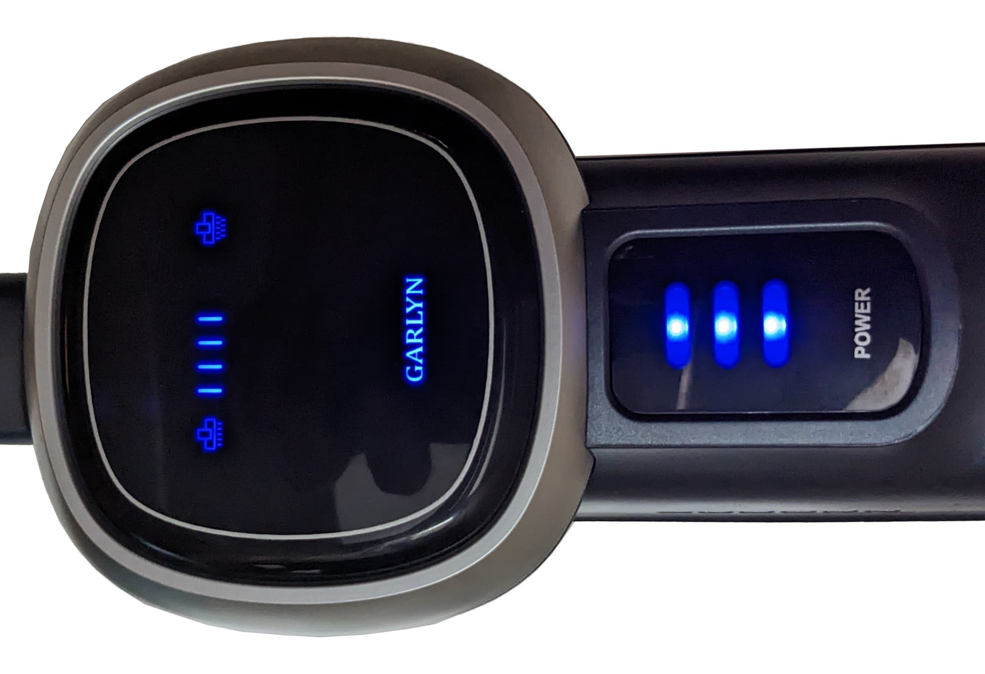 Синие светодиодные индикаторы на верхней стороне моторного блока показывают текущий уровень заряда (на прямоугольном трехсегментном экране) и выбранную скорость (на квадратной панели).