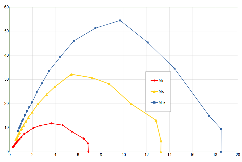 Мощность всасывания (что это такое и как мы ее измеряем, описано в отдельной статье) определяли при работе пылесоса без трубы и насадок, во всех трех режимах. Зависимость мощности всасывания от создаваемого разрежения приведена на графике ниже: