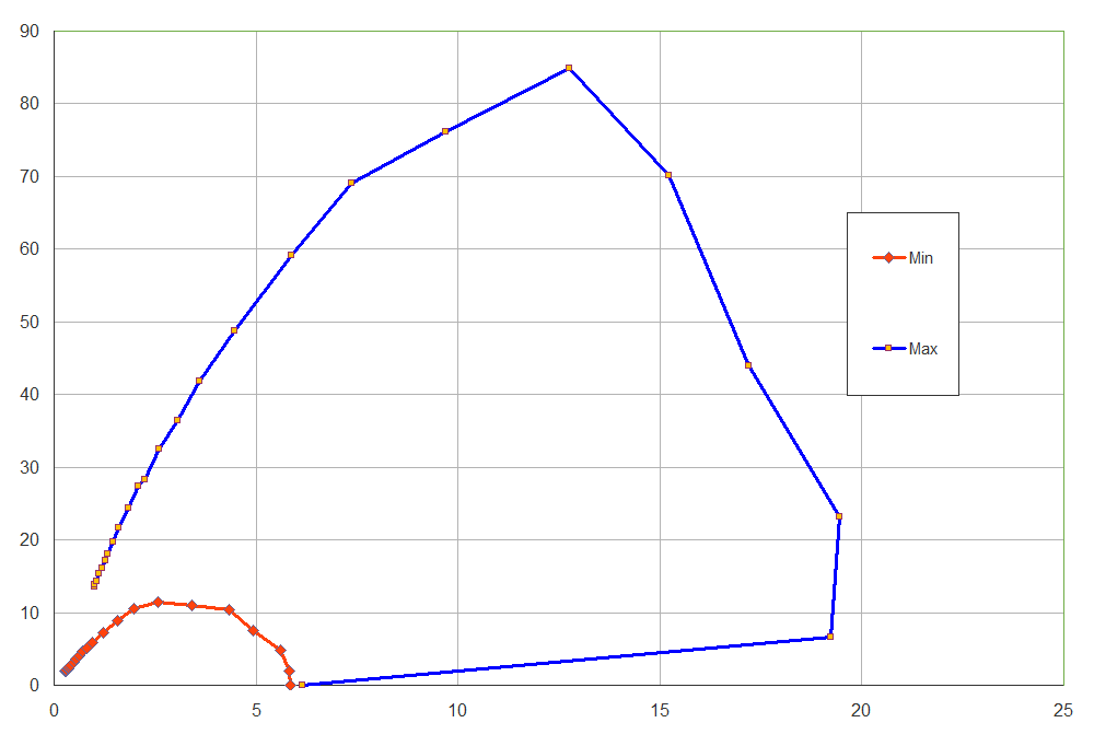 Мощность всасывания (что это такое и как мы ее измеряем, описано в отдельной статье) мы определяли при работе пылесоса без трубы и насадок, в обоих режимах. Зависимость мощности всасывания от создаваемого разрежения приведена на графике ниже:
