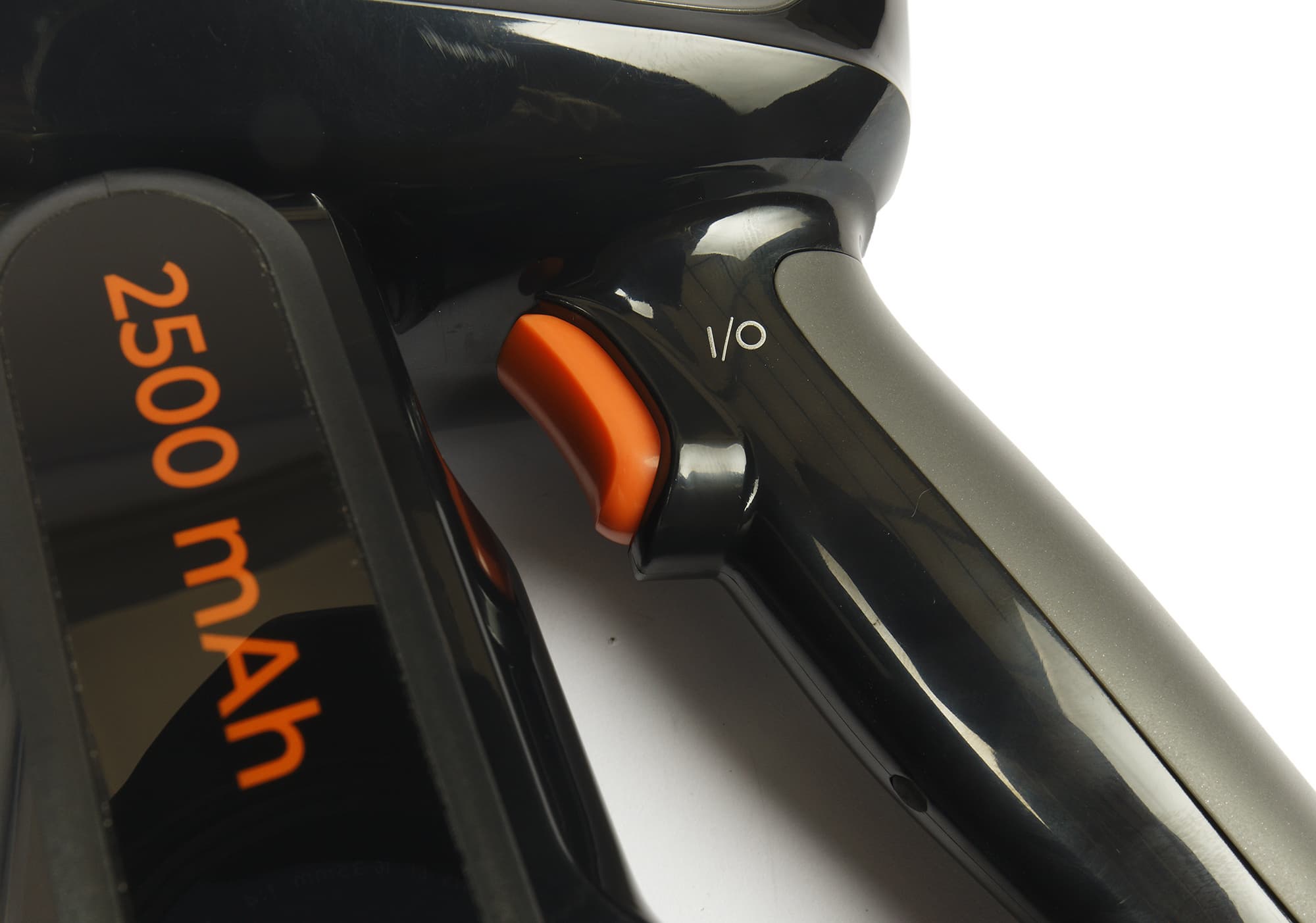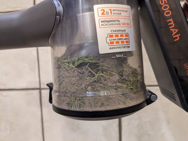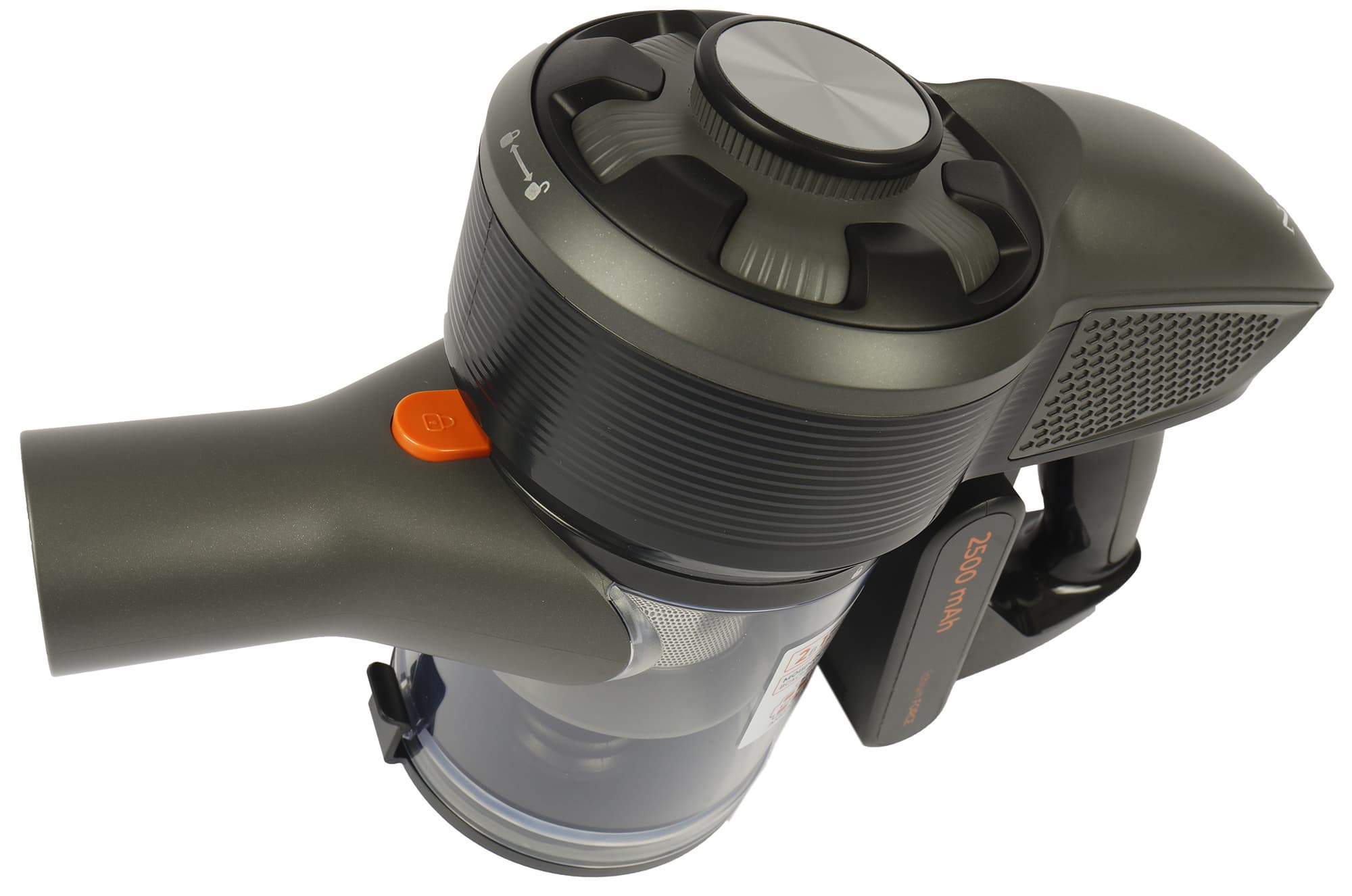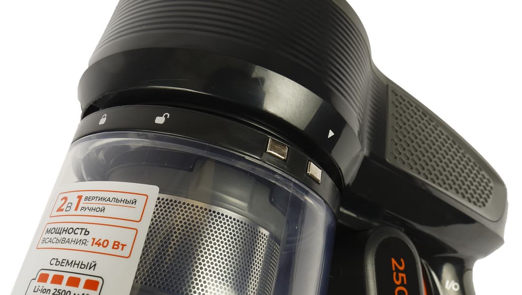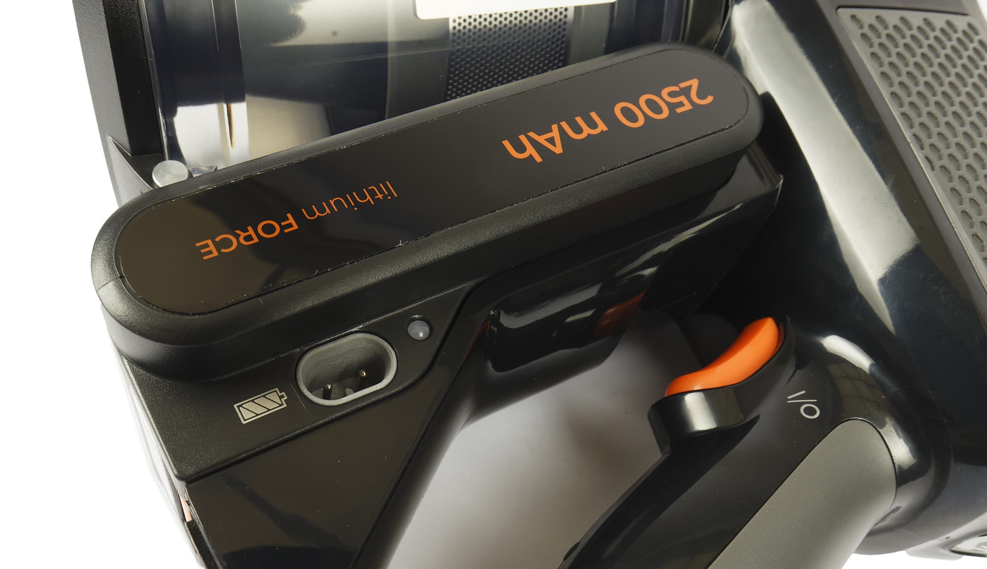 Съемный аккумулятор находится между рукояткой и контейнером для мусора. На нем есть разъем для подключения адаптера питания (заряжать батарею можно как отдельно, так и прямо на пылесосе) и красно-зеленый светодиод, сигнализирующий об уровне заряда.