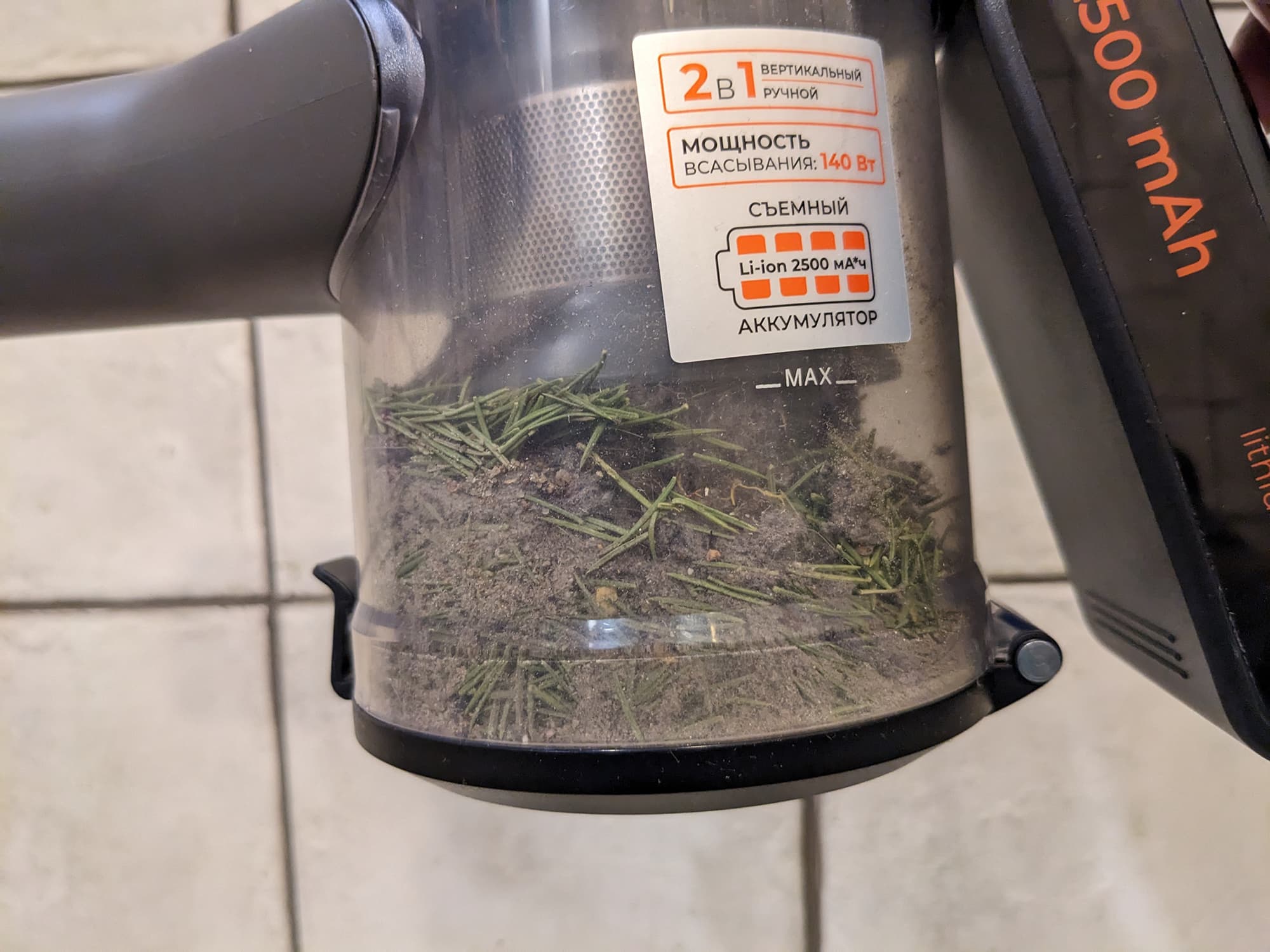 В максимальной конфигурации (основной блок, аккумулятор, удлинительная трубка и насадка для пола) пылесос весит 2340 г, а в минимальной — 1440 г. Вес устройства близок к среднему в этом классе приборов.