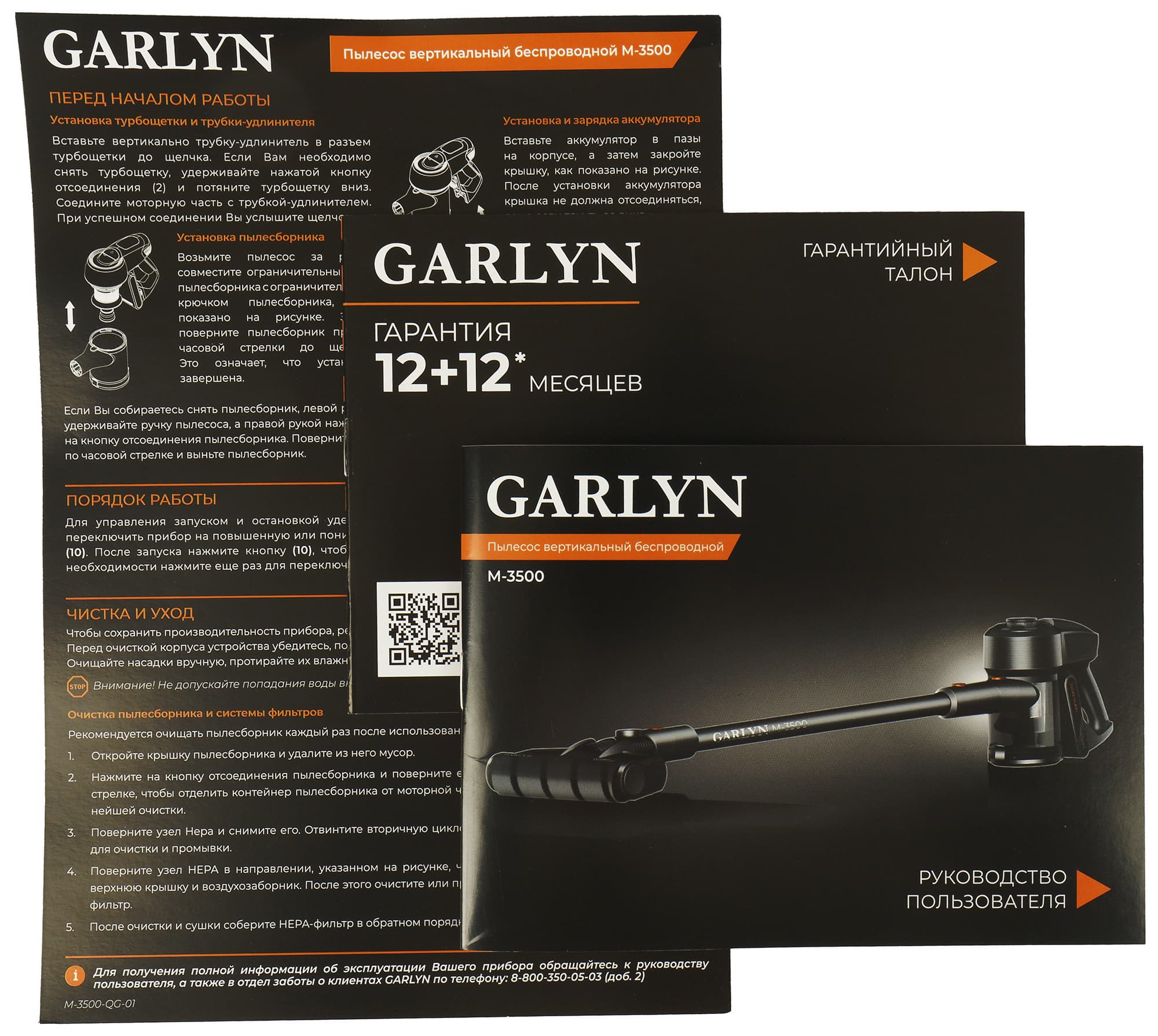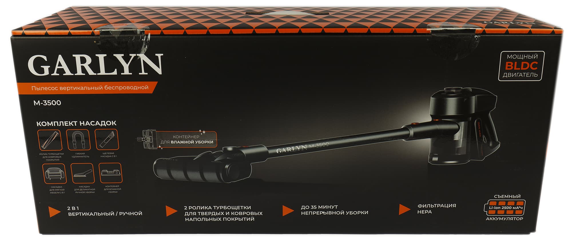 Пылесос M-3500 упакован в картонную коробку, оформленную в фирменных цветах производителя — черном и оранжевом. Боковые стороны украшены традиционным для Garlyn узором в виде треугольников.