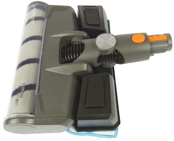 Garlyn M-3500 комплектуется приспособлением для влажной уборки, которое устанавливается на насадку для пола. Оно представляет собой резервуар для воды, снабженный резиновой пробкой и педалью — с ее помощью вода нагнетается на тряпку для протирки.