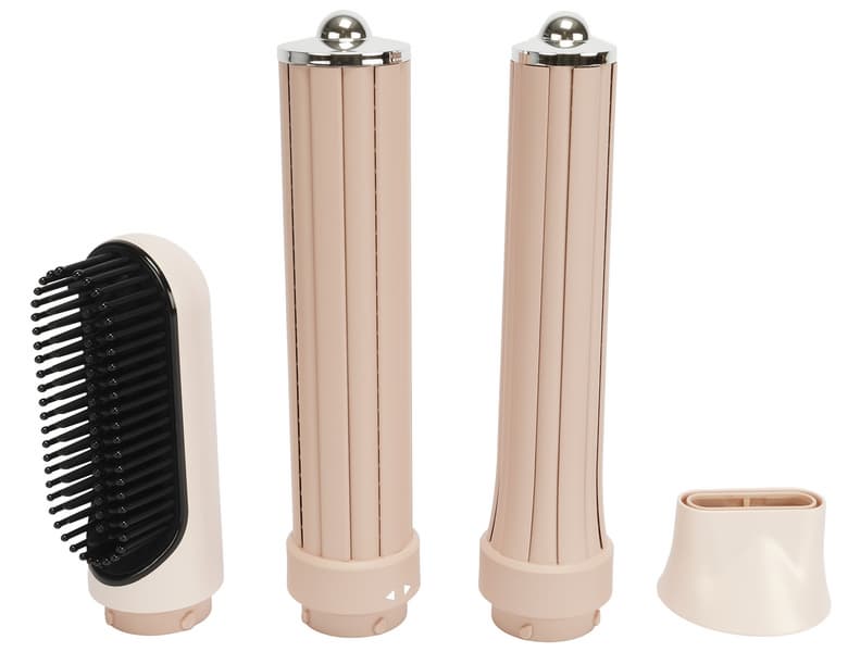 В комплекте к фену идут 4 самостоятельные насадки (насадка-щетка, две насадки для локонов и круглая насадка), которые крепятся непосредственно к корпусу фена, а также насадка-концентратор, которая может дополнять круглую насадку, будучи прикрепленной к ней на магнит.