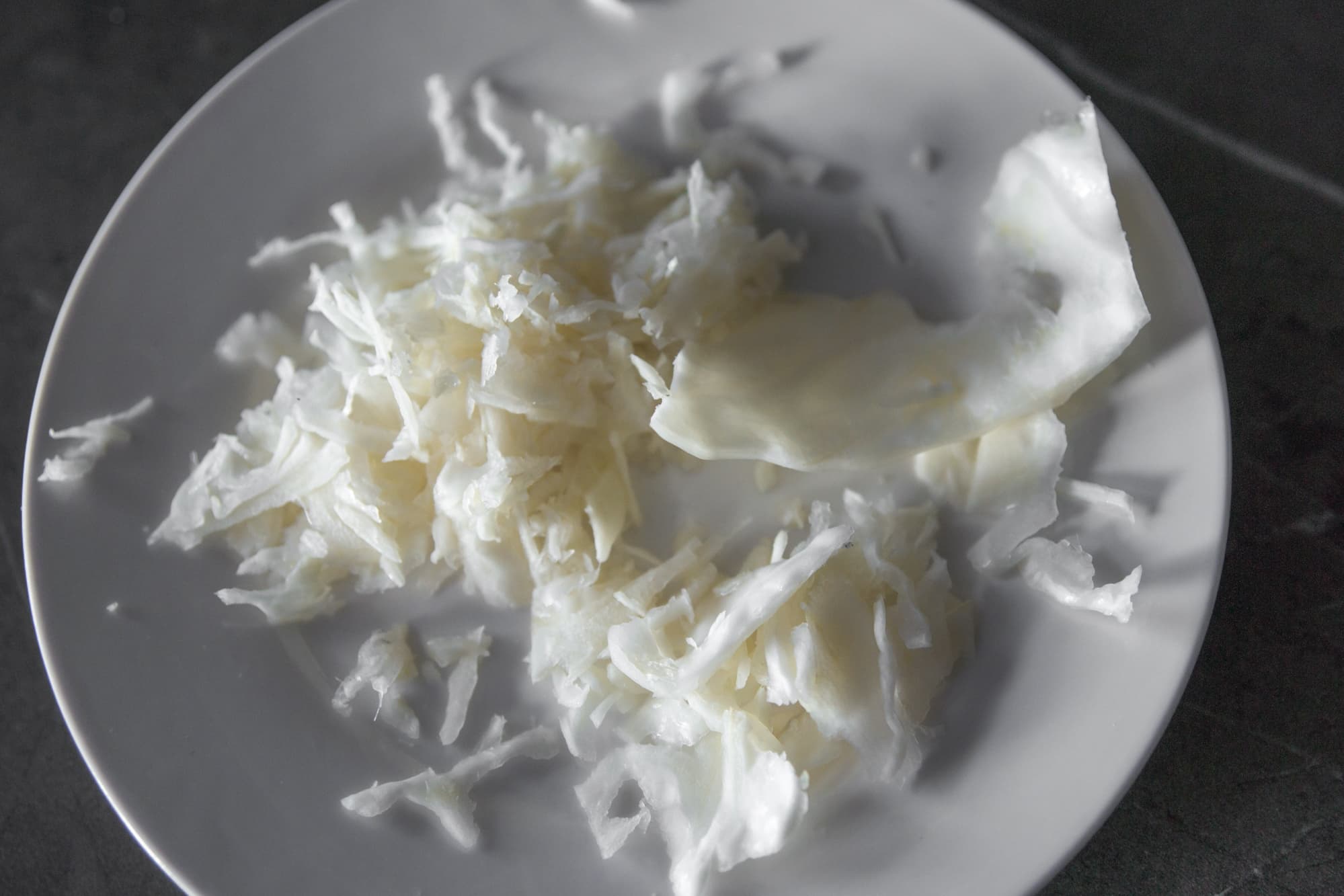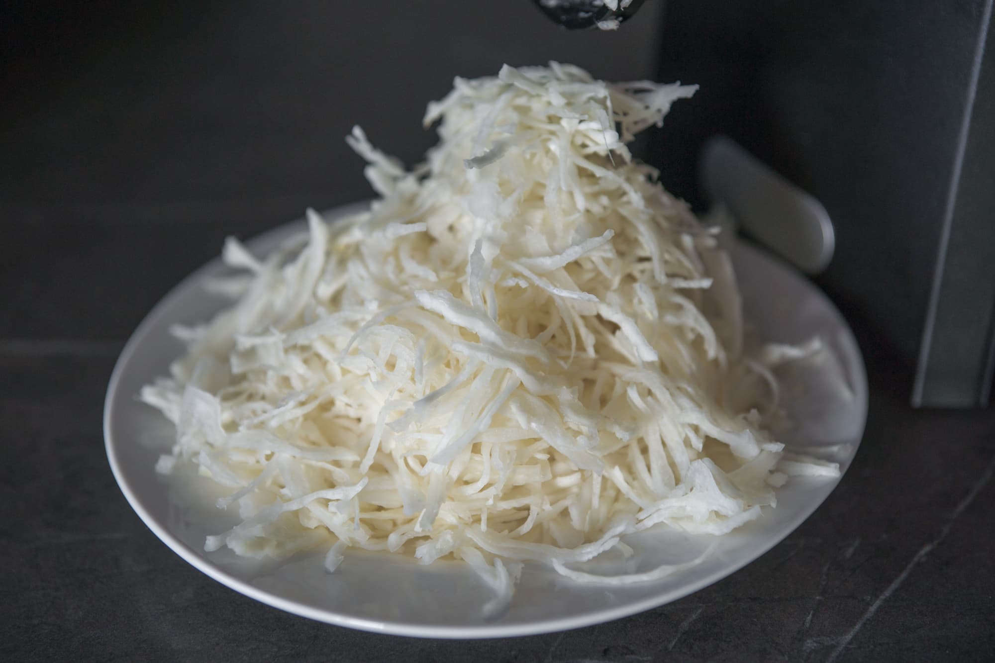 Закрепили на моторном блоке насадку-овощерезку, вставили барабан-шинковку и включили прибор на 1-й скорости. Постепенно подавая стопку листьев в горловину, придавливали ее толкателем. Останавливать работу и извлекать из внутренностей барабана спрессовавшиеся кусочки не приходилось, под давлением выходящей из насадки новой порции стружек они вываливались сами.