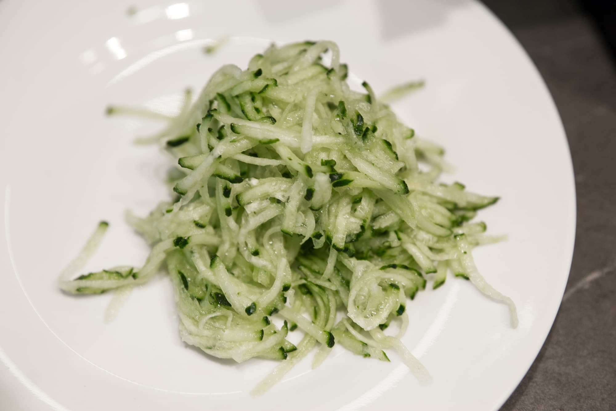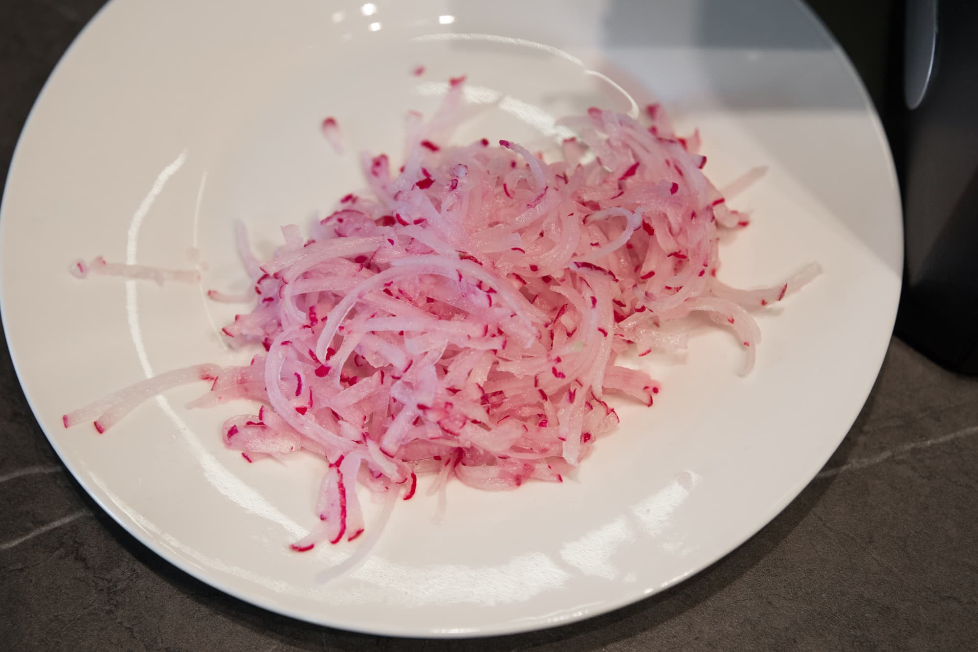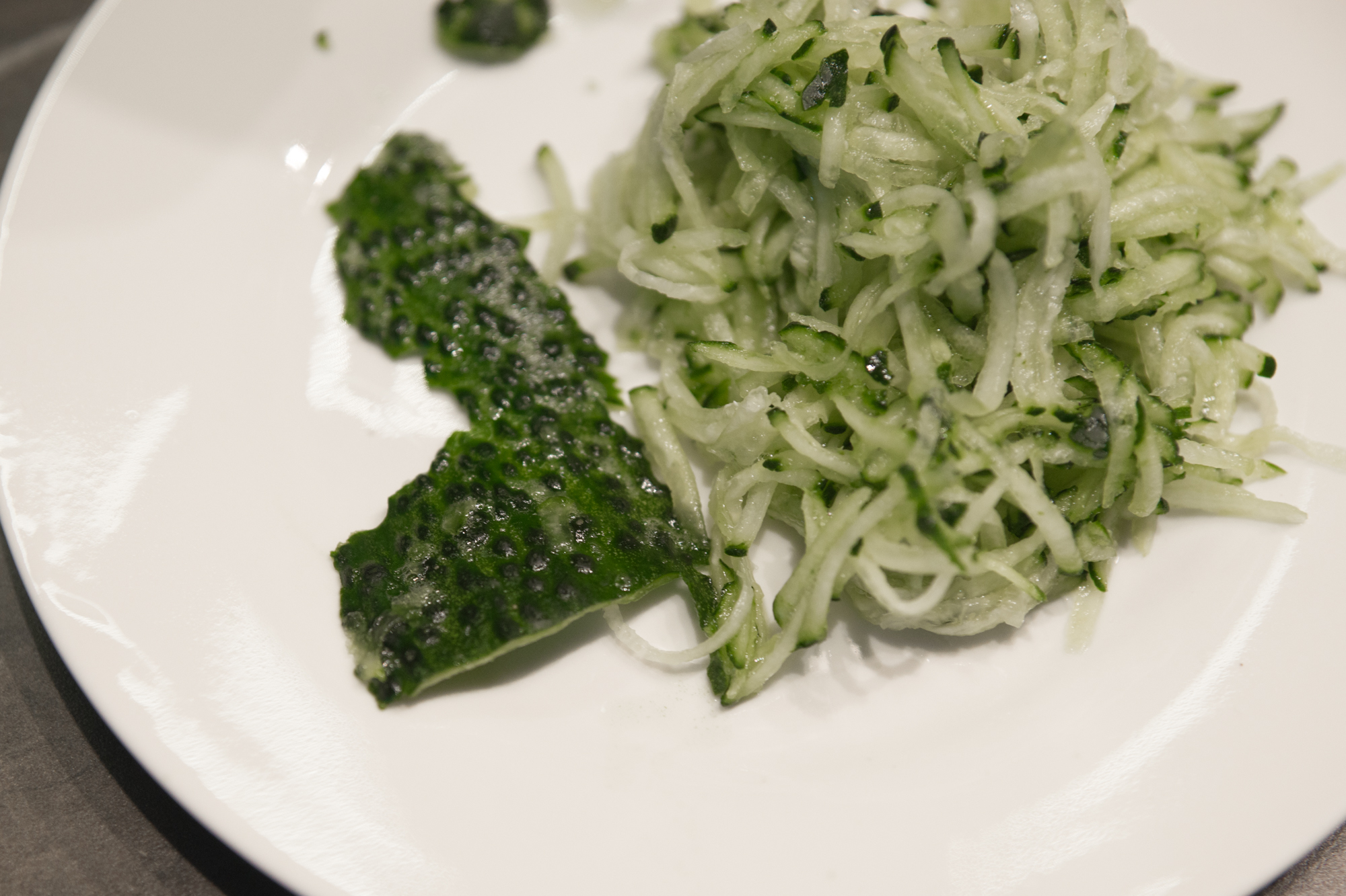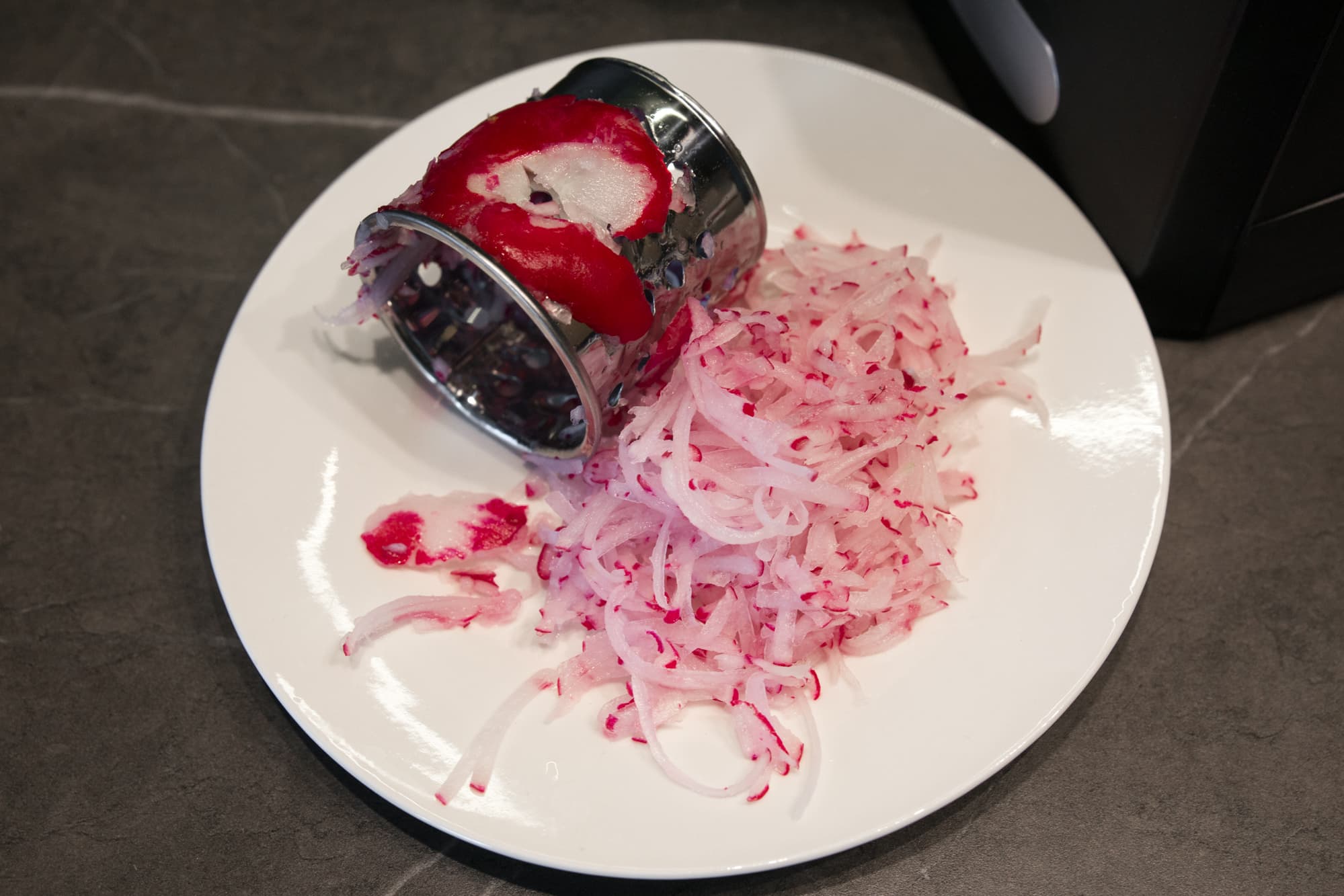 Овощи одинаково быстро измельчились в аккуратную тонкую стружку, а при разборке насадки в обоих случаях оставалось совсем немного отходов в виде необработанных шкурок. В процессе прибор не раскидывал стружку за пределы подставленной тарелки даже при работе на высокой скорости.