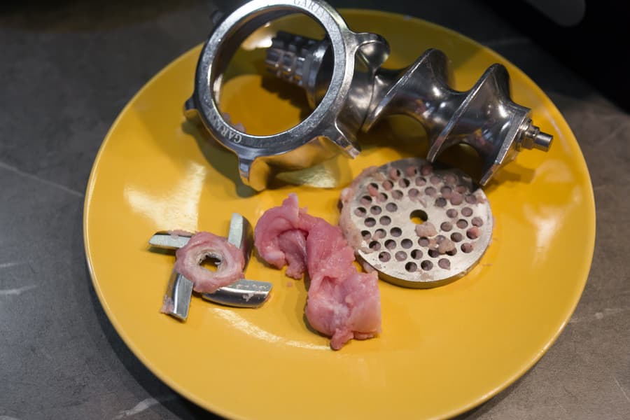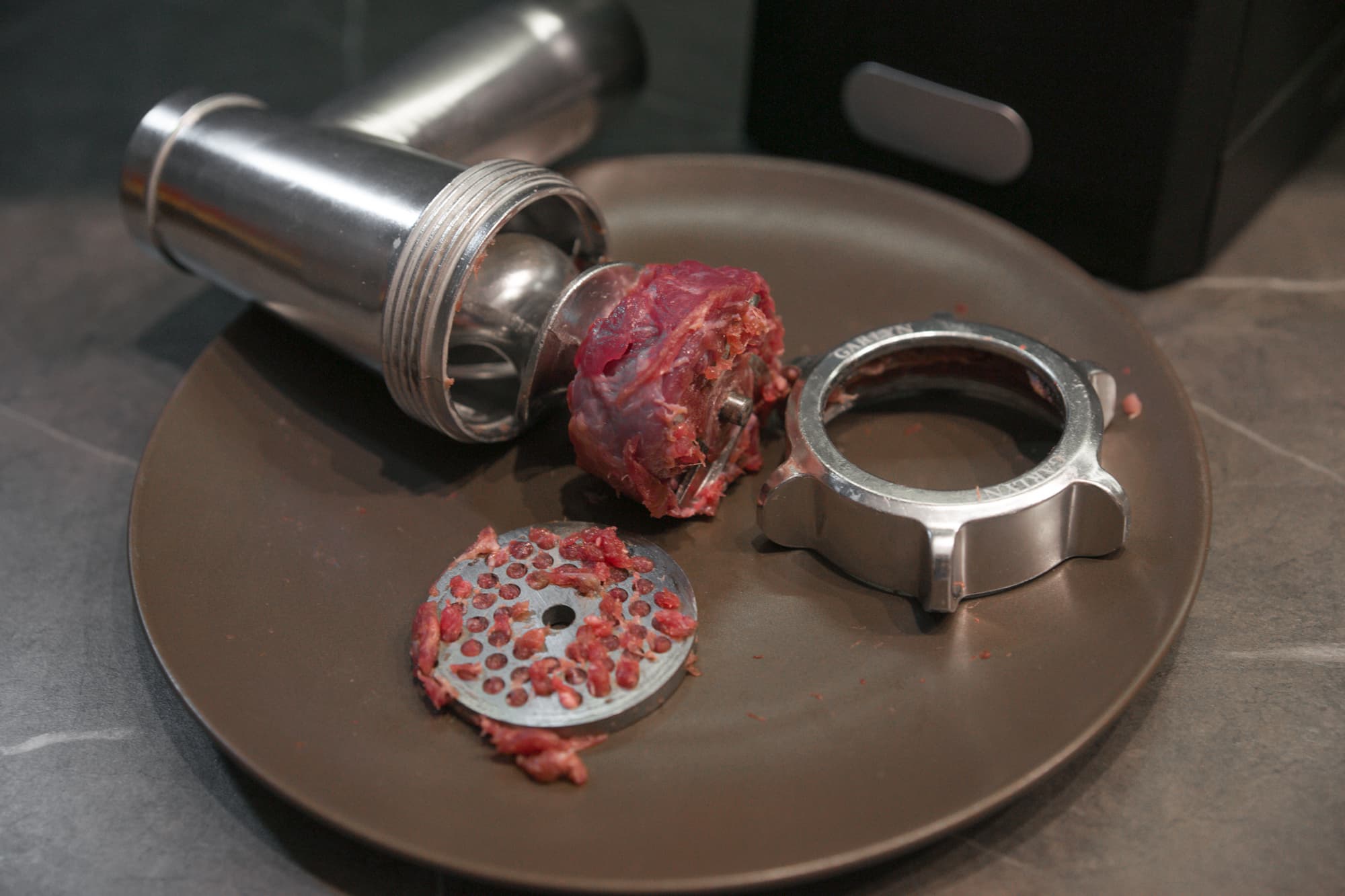 В корпусе мясорубки нас ждал непереработанный кусочек весом около 20 г. В процессе он намотался на шнек, что негативно сказалось на результате.