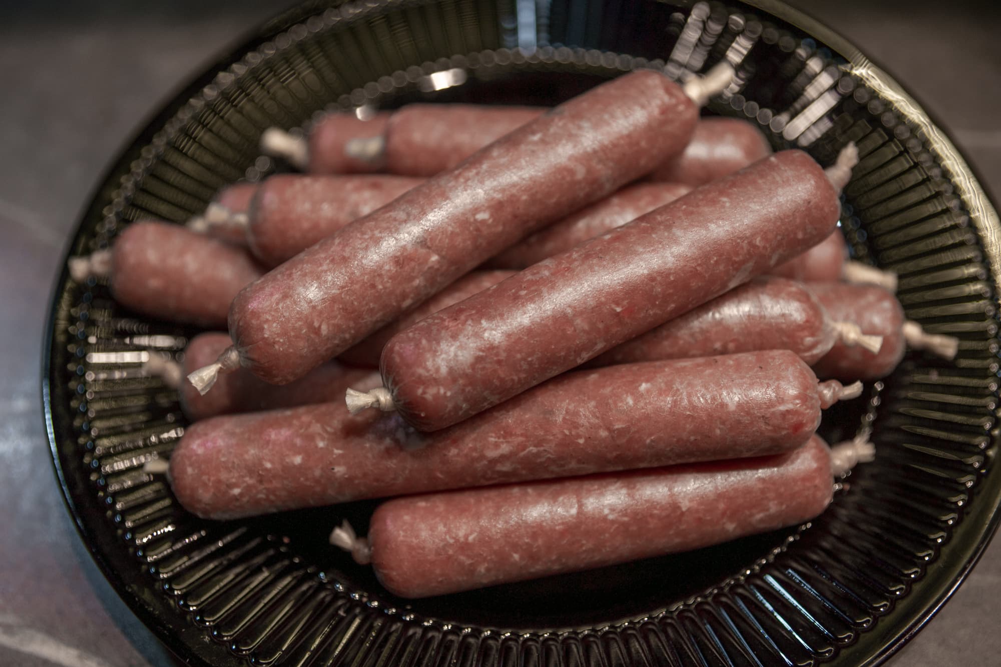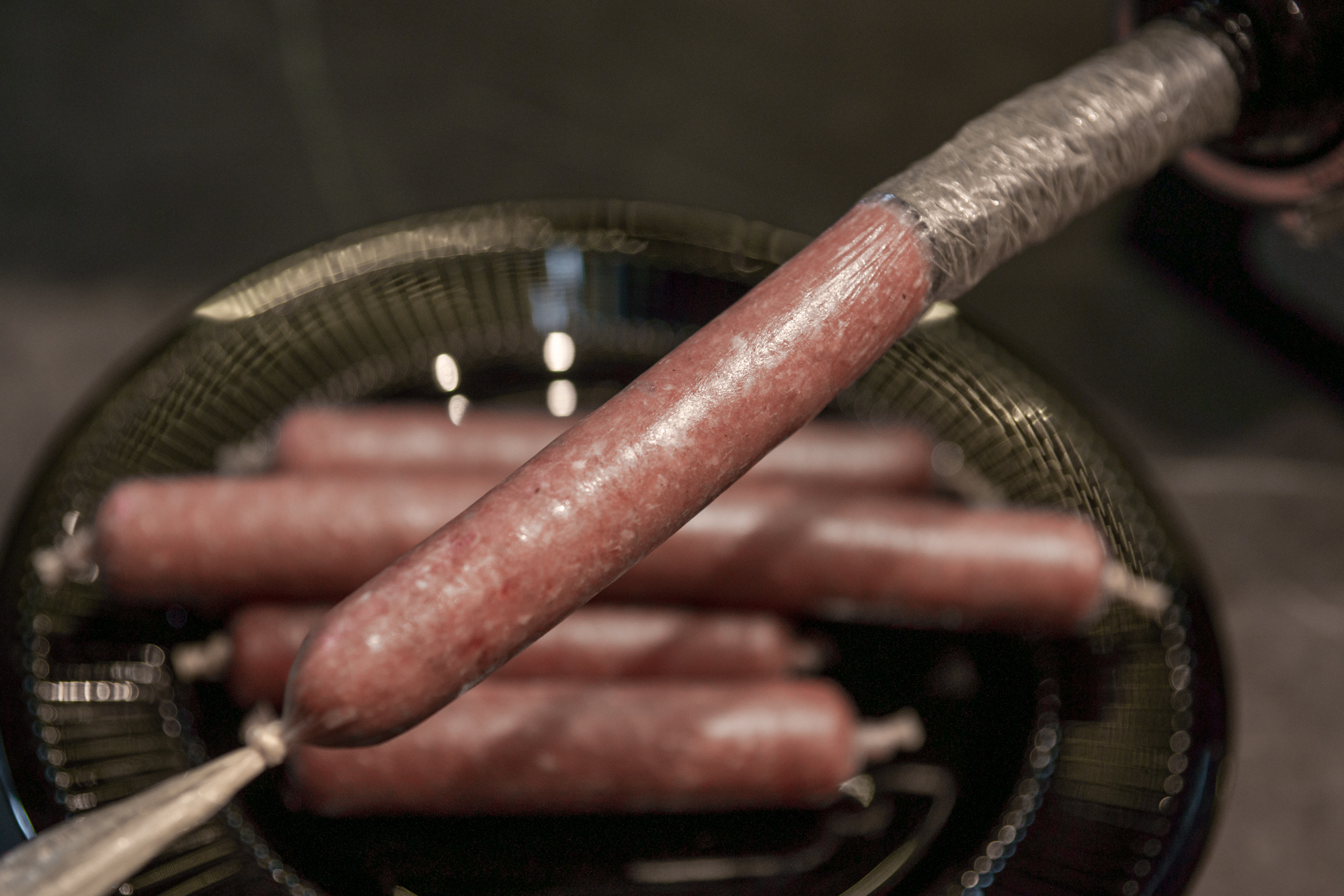 Для колбасок мы взяли по полкило фарша из первых двух тестов, добавили смесь из молотого кориандра, белого молотого перца и гранулированного сушеного чеснока. Посолили, тщательно вымешали и отправили в холодильник настояться. Когда фарш «дошел до кондиции», установили на блок мясорубки самую большую насадку для колбасок диаметром 20 мм, натянули на нее натуральную коллагеновую оболочку и на первой скорости набили почти 3 м колбасок. Процесс шел легко, фарш отлично проталкивался в горловину и неспешно набивался в оболочку.