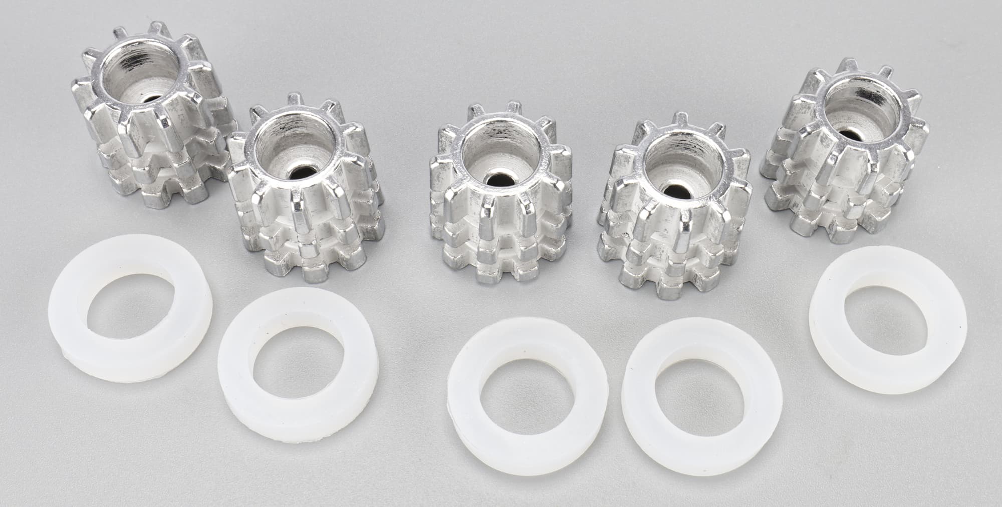 Шнек мясорубки в месте присоединения имеет металлический (похоже, что силуминовый) предохранитель от перегрузки и силиконовое уплотнительное кольцо. Предохранитель нужен для того, чтобы в случае попадания обломков костей или фруктовых косточек взять весь удар на себя. Если деталь повредится, в комплекте есть солидный запас, аж целых 5 штук — такого уровня предусмотрительности, мы, пожалуй, ещё не встречали ни у одного производителя.
