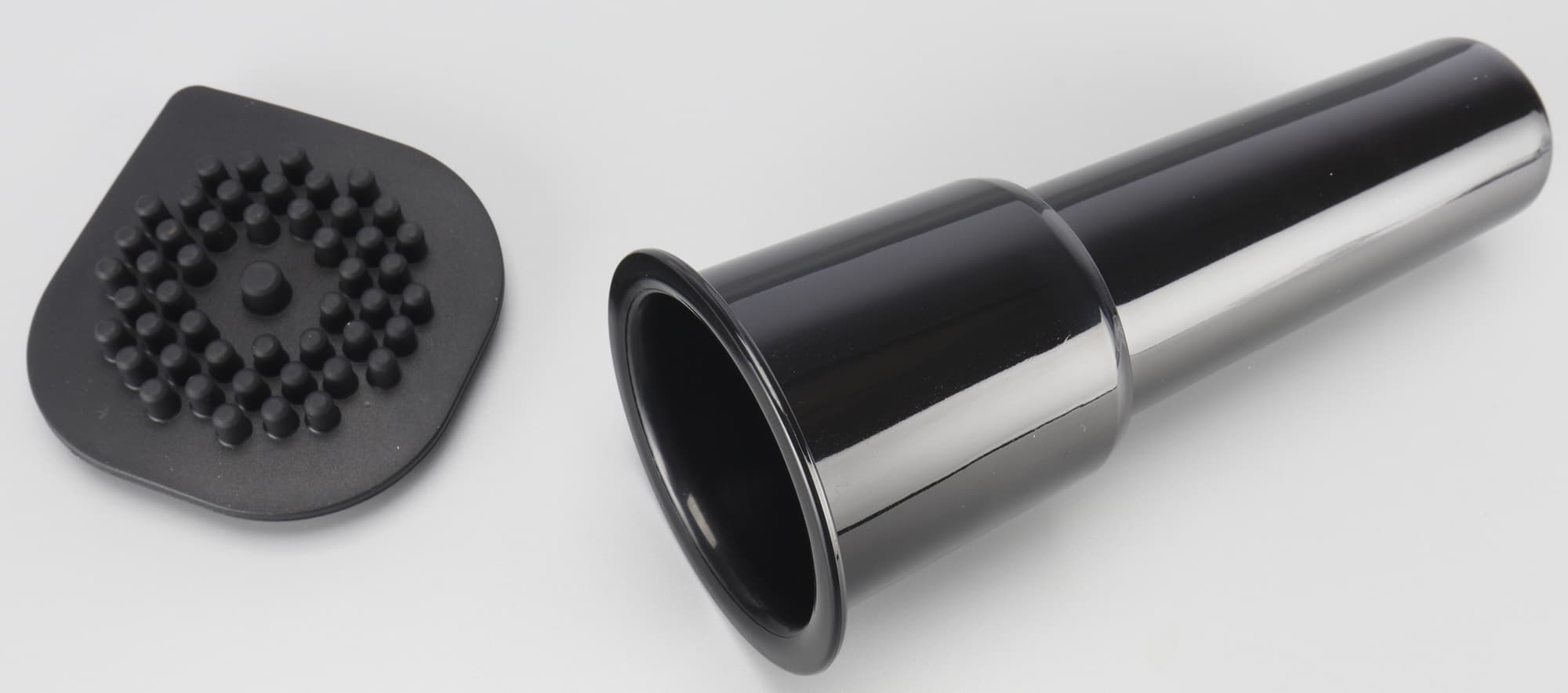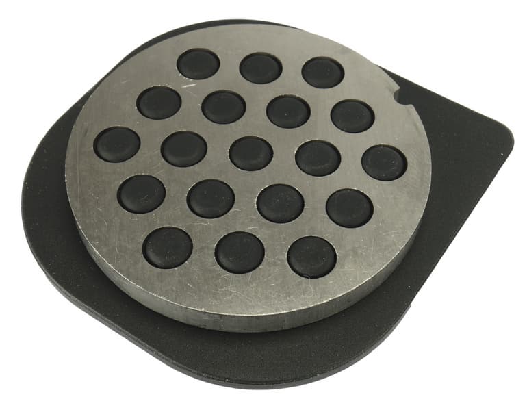 Для очистки решеток в комплекте есть специальное приспособление. Резиновая плашка имеет две стороны, подходящие к дискам с крупными и средними отверстиями. Идея хорошая, но лучше бы «пальчики» были негнущимися, тогда совмещать их с отверстиями получалось бы быстрее.