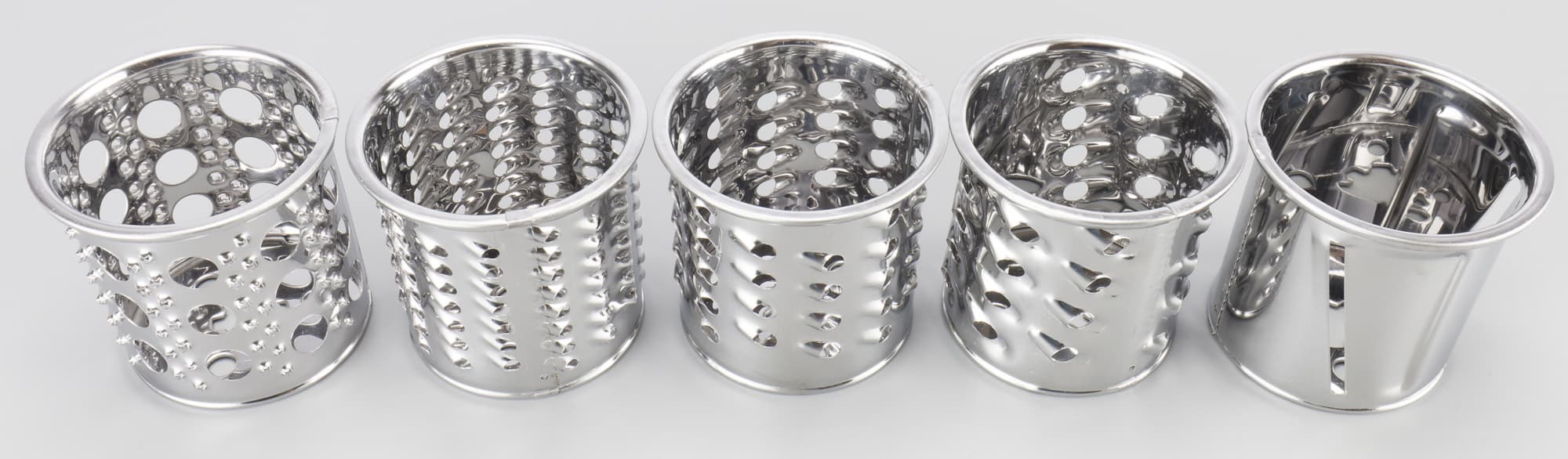 Овощерезка укомплектована пятью насадками: тремя терками разного размера, шинковкой и теркой для драников. Диаметр цилиндра 6 см. Металл отлично обработан, режущие кромки терок очень острые.