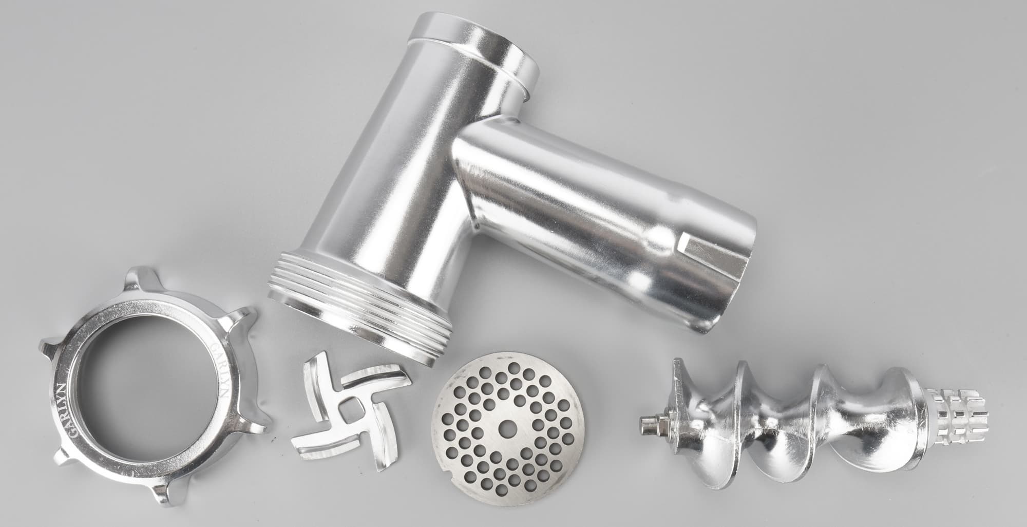 Блок мясорубки типовой конструкции состоит из: горловины, шнека, ножа, решетки и кольцевой гайки закрепляющей конструкцию. Кольцо довольно крупное, с выступами для удобства отвинчивания.