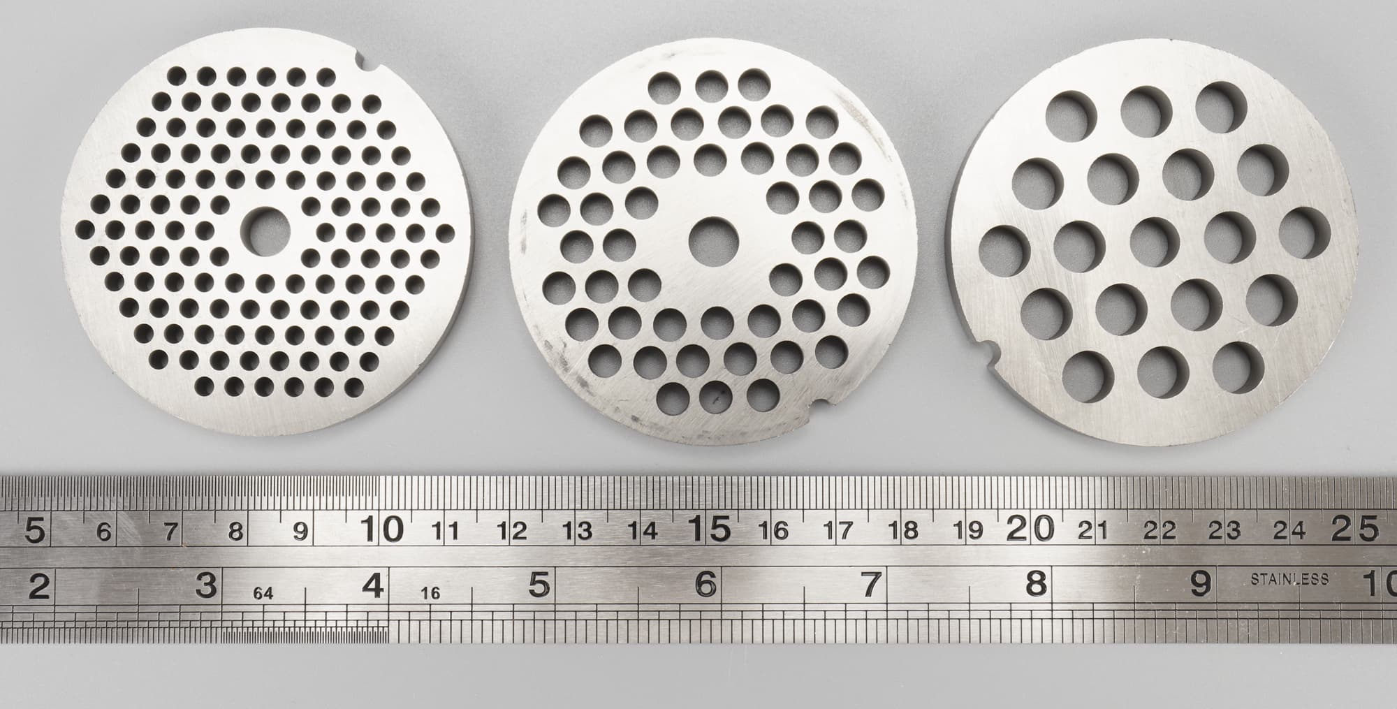 Нож и диски для приготовления фарша массивные, толстые и очень хорошо заточенные. Диски имеют отверстия 3, 5 и 8 мм.