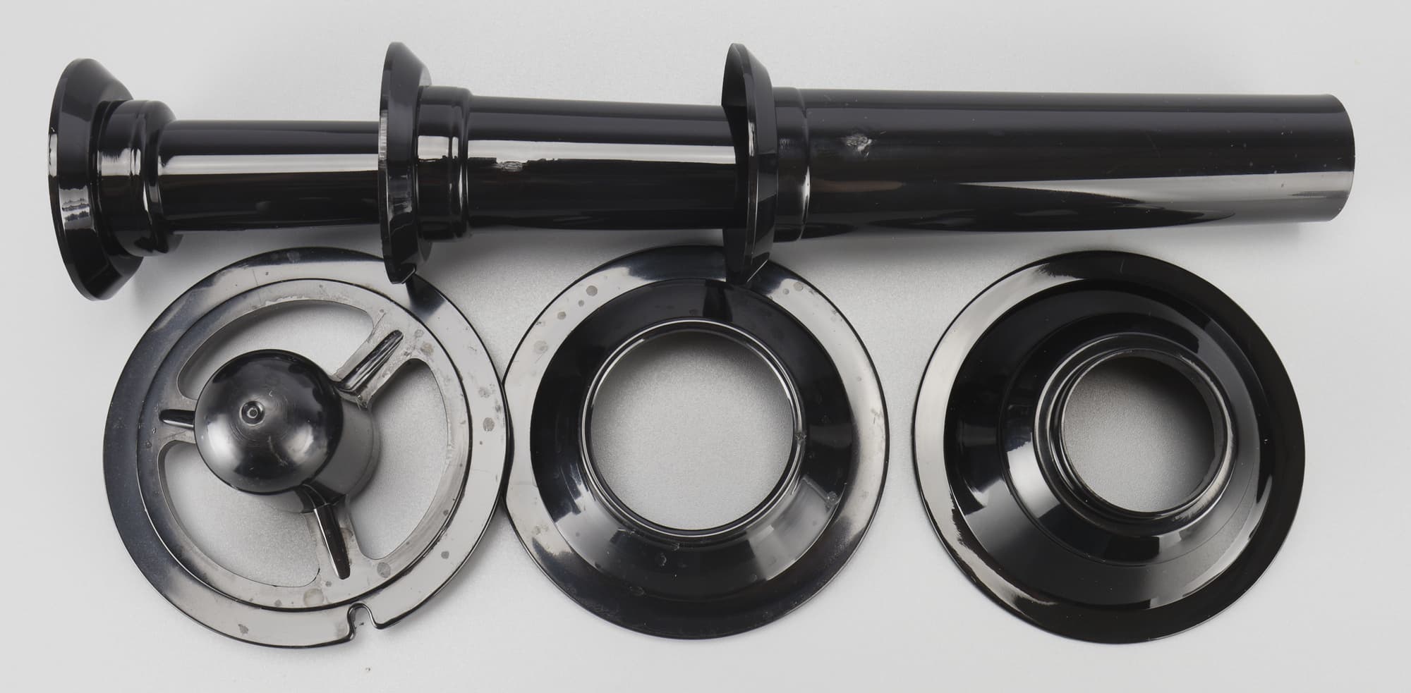 На фотографии ниже мы видим пластиковые насадки для колбасок: 20, 15 и 11 мм. Ниже под ними: насадка для кеббе и основания насадок для их установки на блок мясорубки.