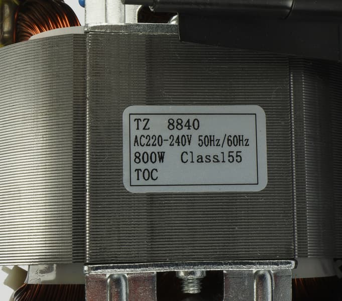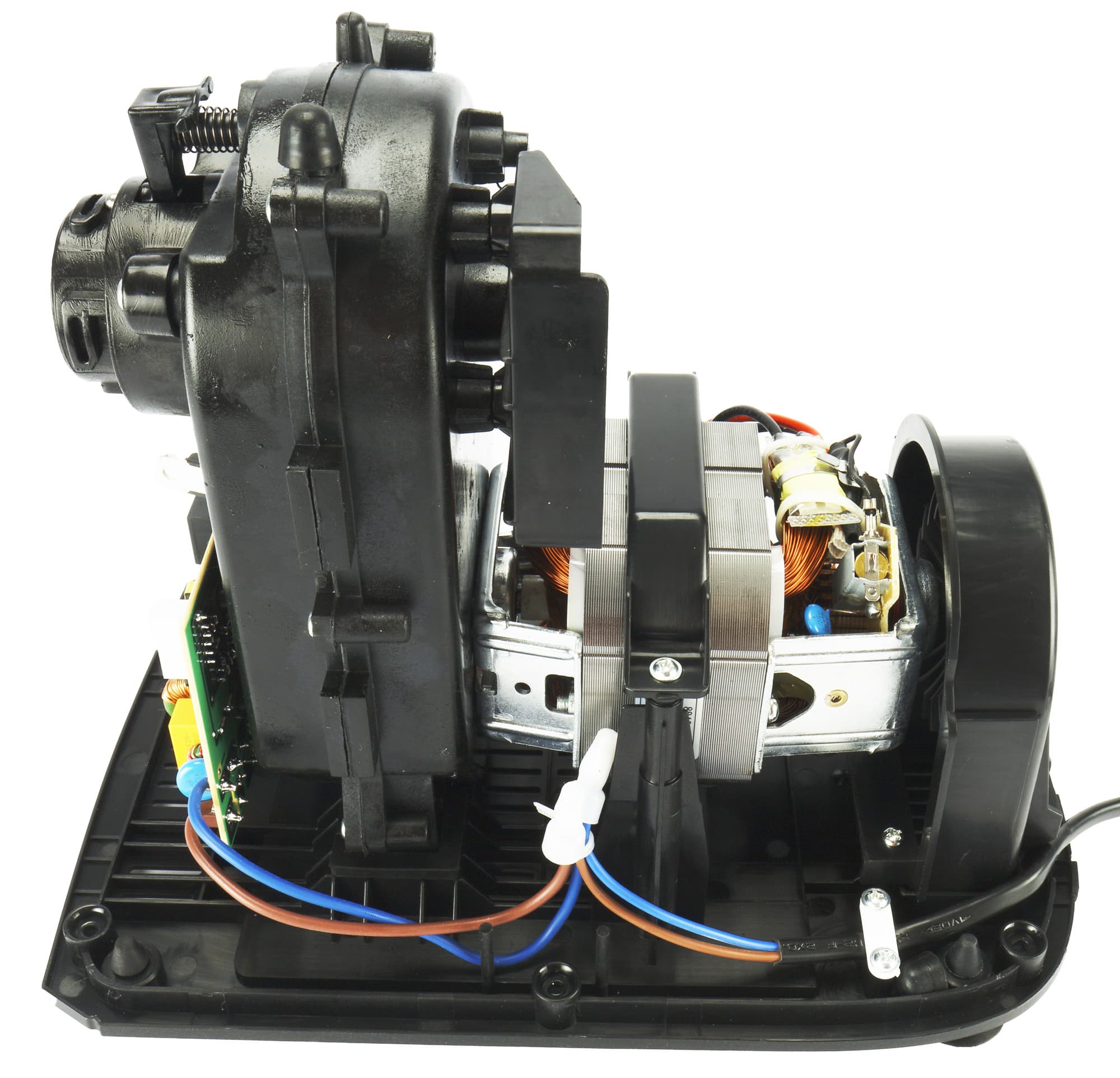 Внутреннее устройство без сюрпризов: электромотор и крыльчатка вентилятора охлаждения. Проводные соединения выполнены аккуратно.