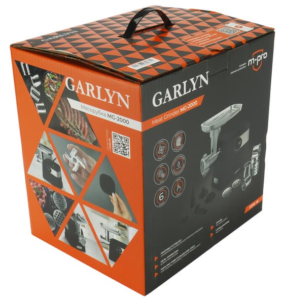 Мясорубка Garlyn MG-2000 поступила к нам на тестирование в компактной коробке из плотного картона с качественной цветной полиграфией. На лицевой и обратной сторонах яркой упаковки в фирменной расцветке размещены фотографии самого устройства, а также описание его ключевых особенностей. На боковых гранях можно найти подробную информацию о комплектации прибора и список его технических характеристик.