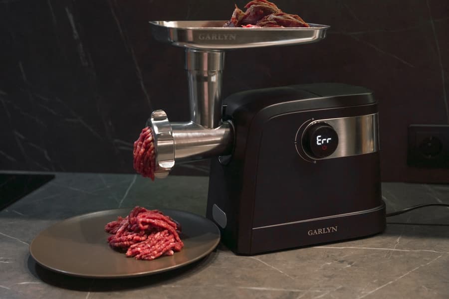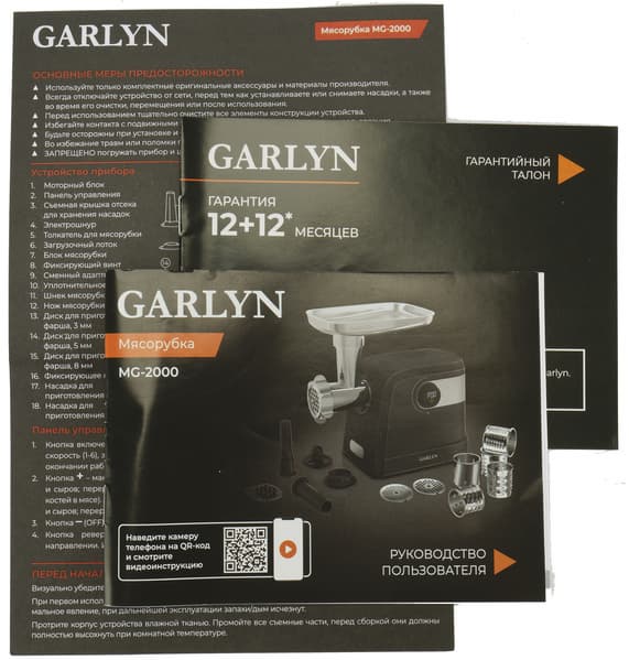 Мясорубка Garlyn MG-2000 удобна в эксплуатации, управление и сборка-разборка — элементарные. Корпус устойчивой формы снабжен присосками, благодаря которым аппарат не сдвигается с места во время работы даже при высокой нагрузке. Прибор не занимает много места и оснащен вместительным контейнером для аксессуаров. Хотелось бы отметить и комплектацию: помимо трех стандартных дисков для переработки фарша и насадок для колбасок и кеббе, присутствуют насадка-овощерезка с пятью цилиндрами для разных видов измельчения и запас предохранителей для шнека мясорубки.