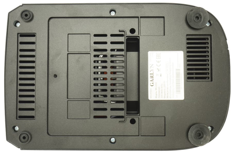 Тяжелый корпус держится на столе очень устойчиво. Кроме собственного веса, помогают ему в этом четыре ножки, две из которых оснащены присосками. Так же на дне устройства находятся вентиляционные прорези и шильдик с технической информацией.