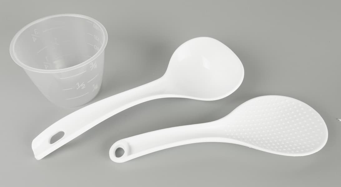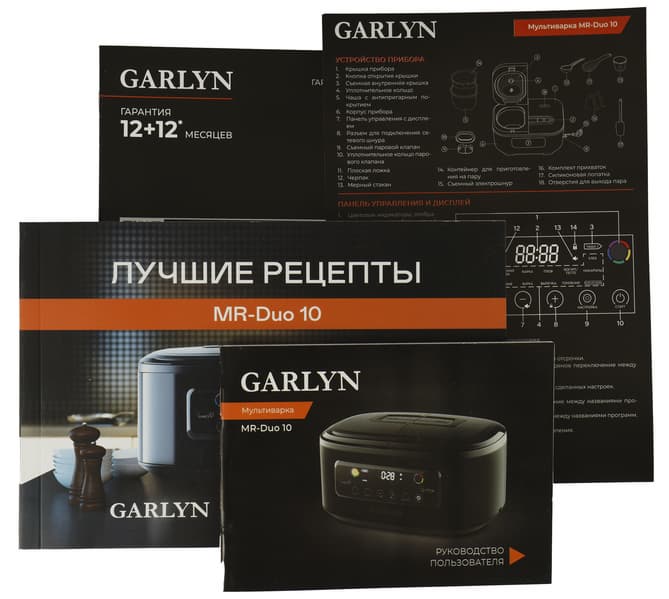 В комплект Garlyn MR-Duo 10 также входят две удобные силиконовые прихватки с ребристой противоскользящей поверхностью, мерный стакан с рисками, силиконовая лопатка, пластиковые ложка и черпак.