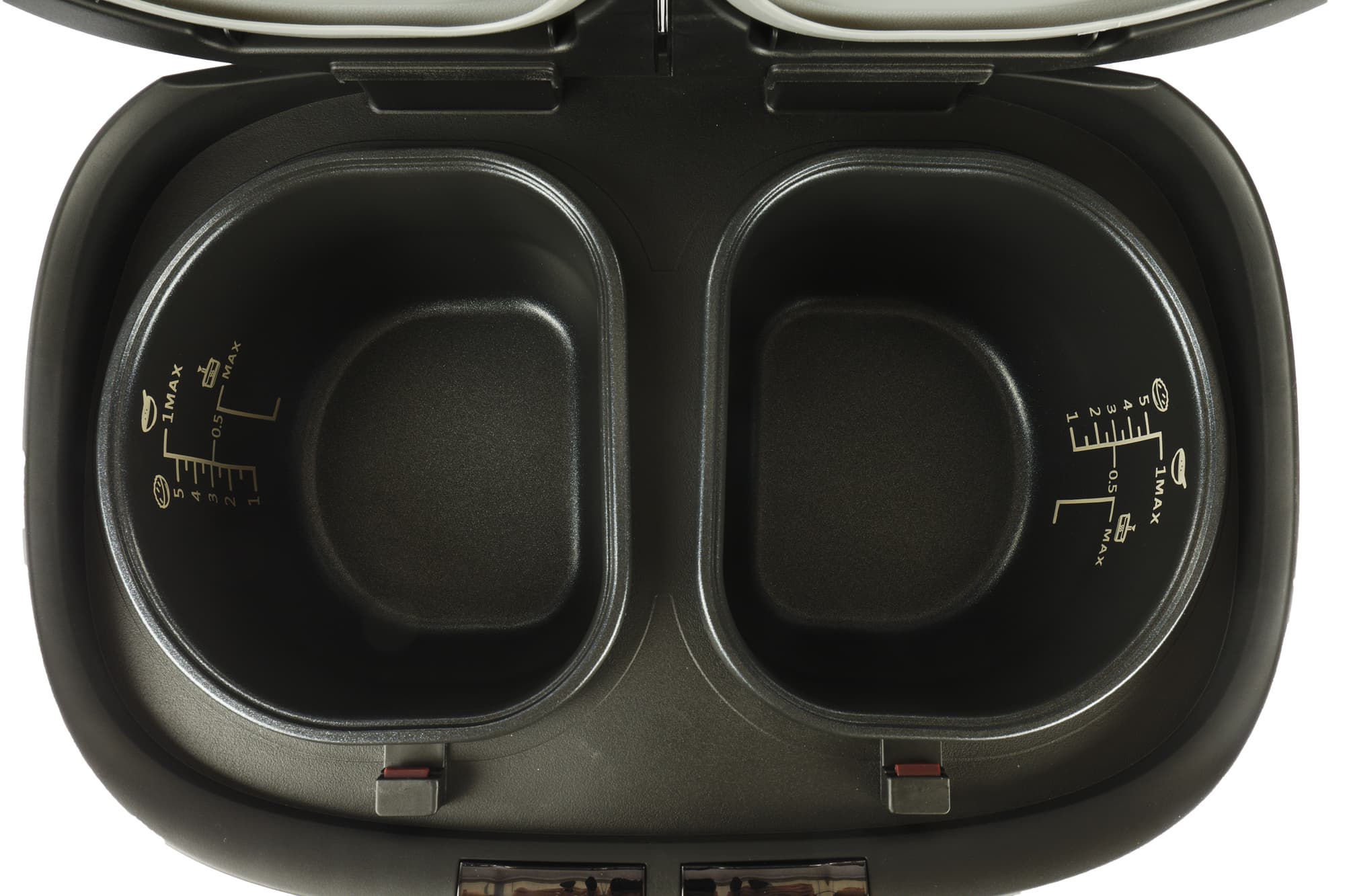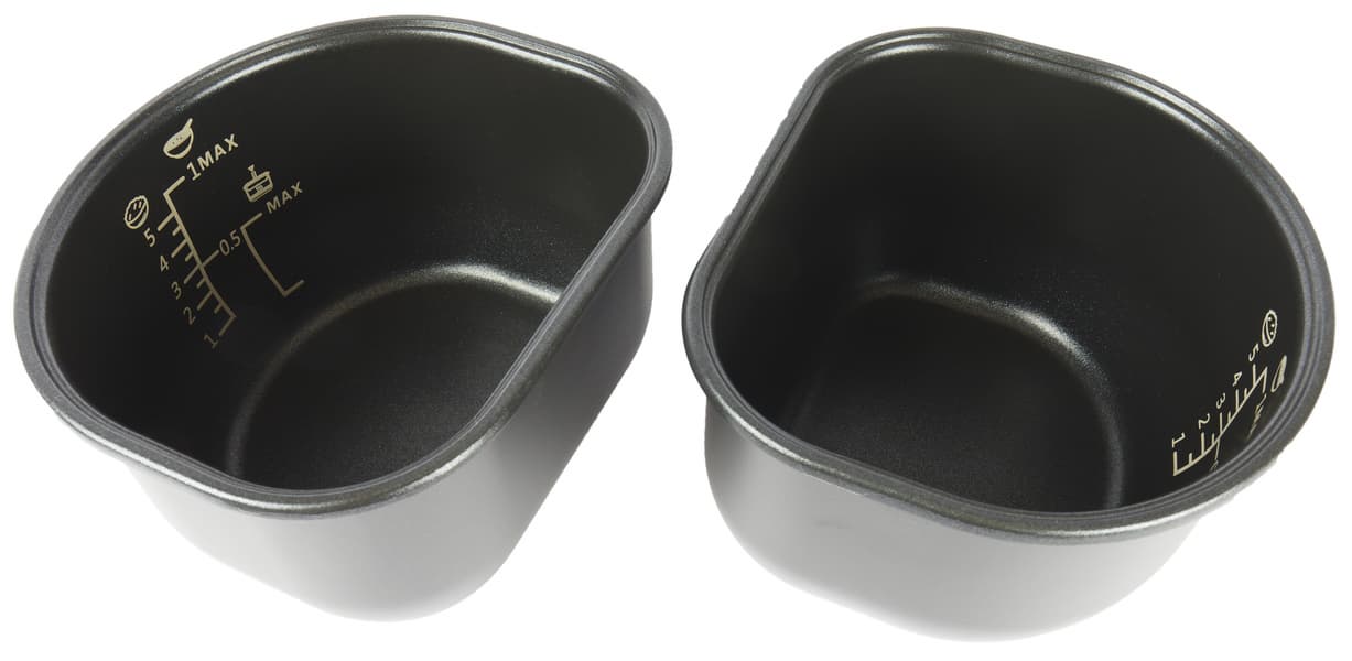 Рабочий объем чаши до верхней отметки Mаx составляет ровно 2 литра. Нижняя риска с подписью Max — это максимальное количество воды при приготовлении на пару́, до этой отметки в чашу помещается 1 литр. У емкостей есть небольшие бортики. Вставлять и извлекать чаши из корпуса мультиварки удобно.