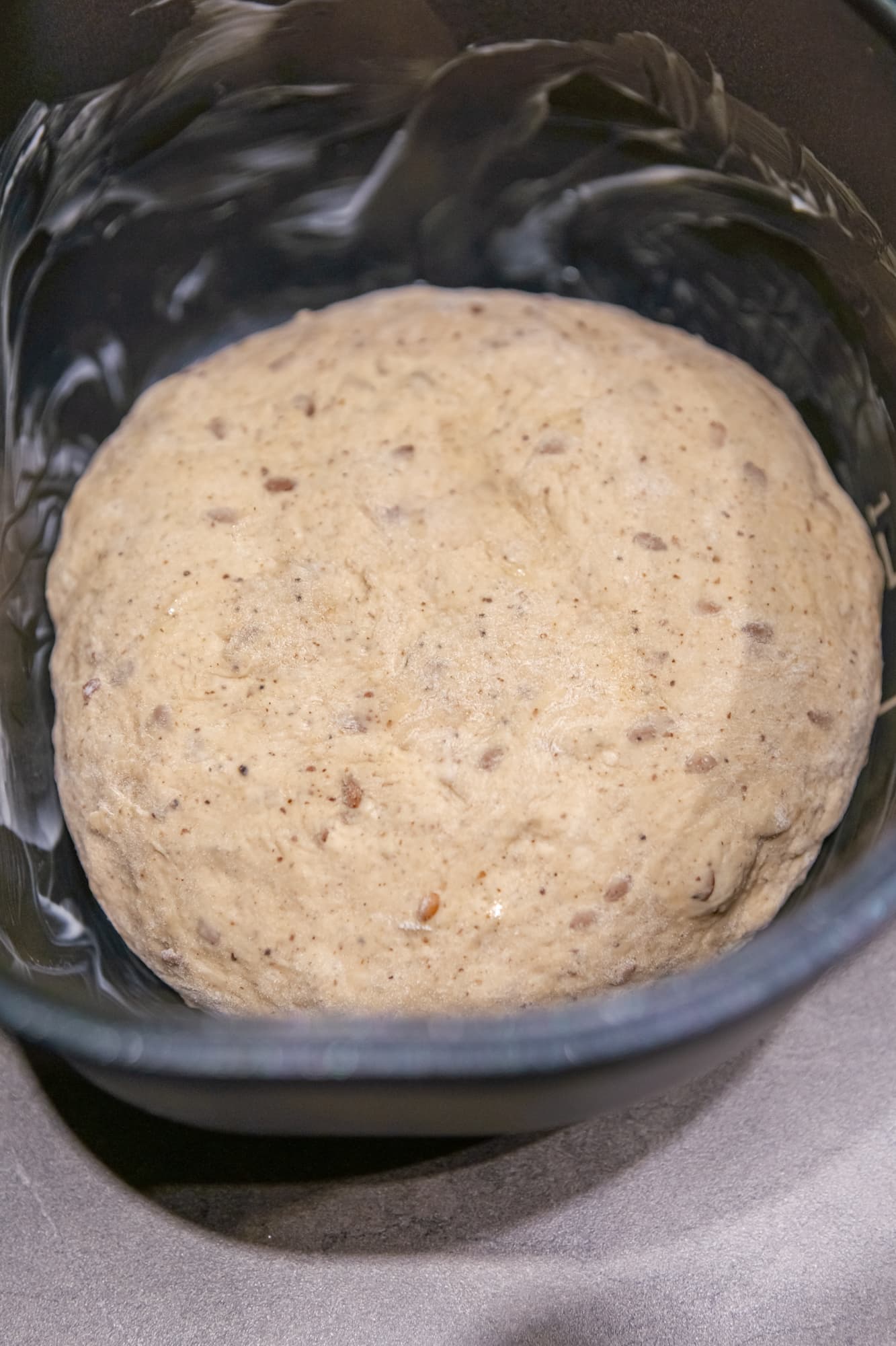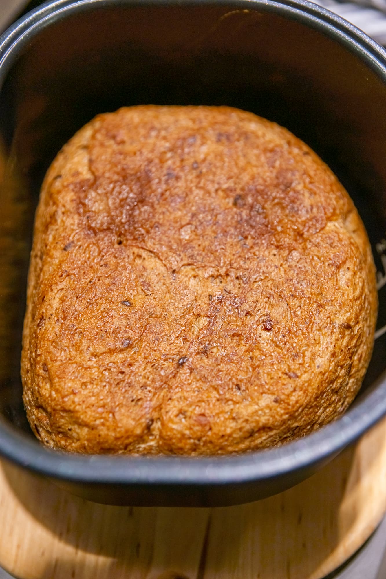 За час до окончания программы раздался звуковой сигнал. Мы открыли чашу и перевернули хлеб. Снизу и по краям он уже приобрел аппетитную корочку, теперь будет запекаться верхушка. На фото ниже — перевернутый хлеб.