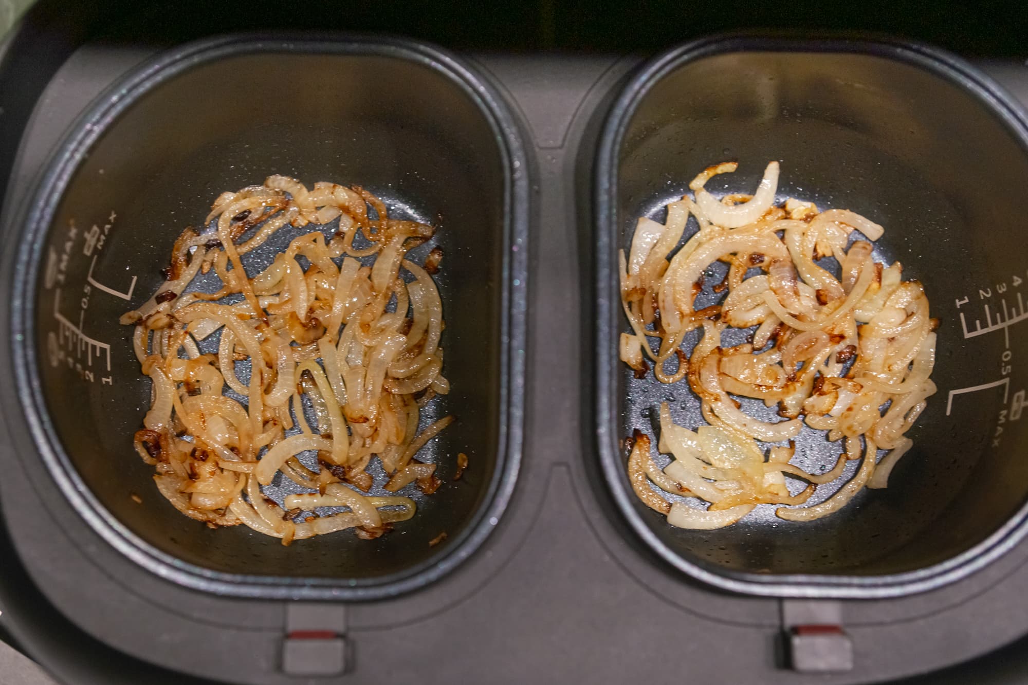 В левую чашу поместили нарезанный репчатый лук и включили программу Жарка. В правую положили вторую часть лука и для сравнения запустили Garlyn шеф на максимальных 130 °C. На разогрев чаш ушло около 3,5 минут. Не быстро, но верно лук приобрел золотистую корочку и при периодических перемешиваниях за 15 минут полностью прожарился. Результат в обеих чашах получился одинаково хорошим. В процессе жарки мы измеряли температуру дна чаши пирометром. Нагрев в обеих емкостях составлял от 130 до 160 °C.