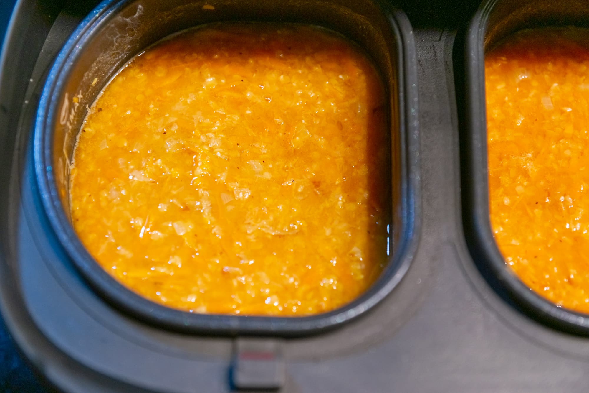 Добавили в чаши промытые 400 г чечевицы, соль, специи, залили водой в количестве литра на чашу и перемешали содержимое. Поменяли режим на Суп, установили время на 30 минут и закрыли крышки. За 10 минут до готовности добавили в каждую емкость по 1,5 столовые ложки томатной пасты и еще раз тщательно перемешали.